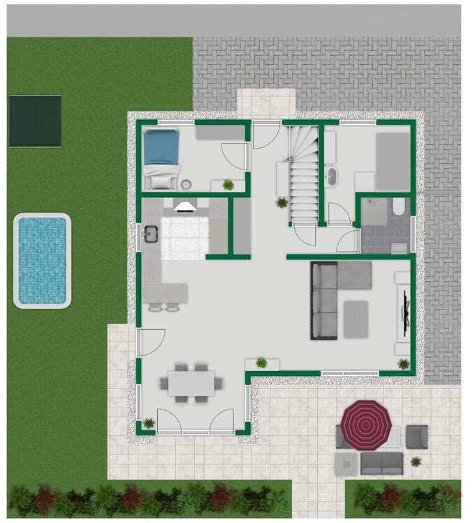 Das Erdgeschoss empfängt Sie mit einem hellen und großzügigen Wohn-, Ess- und Kochbereich, der dank großer Fensterflächen und eingelassener Decken-Spots ein offenes, modernes Ambiente schafft. Die stilvolle Einbauküche aus dem Baujahr 2020 ist bereits im Kaufpreis enthalten und überzeugt durch hochwertige Geräte und viel Arbeitsfläche. Ein zusätzliches Zimmer im Erdgeschoss eignet sich perfekt als Schlafzimmer, Büro oder Gästezimmer. Ein modernes Bad mit bodengleicher Dusche, WC, Waschbecken und Fenster, ein praktischer Hausanschlussraum mit Technik, Waschmaschinenanschluss und Waschbecken sowie ein großer Einbauschrank im Eingangsbereich mit Stauraum unter der Treppe ergänzen diese Etage.