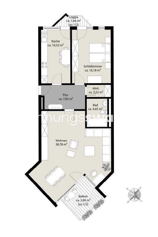 Zimmeranzahl :2 Wohnfläche :ca. 85,00 m² Etage :3 Balkon :