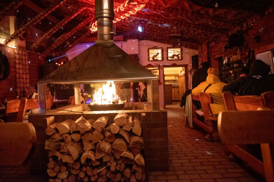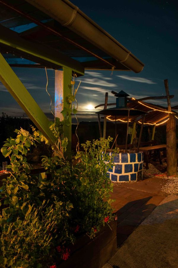 Professionelle Küche für bis zu 70 Personen, Frühstücksraum, Gemeinschaftsraum mit Kamin, überdachter Grillplatz.