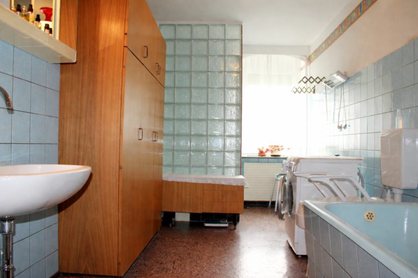 Im Erdgeschoss befinden sich das Wohnzimmer mit angrenzender Küche und Essbereich sowie ein Tageslichtbad mit Badewanne und Dusche, das modernisierungsbedürftig ist.