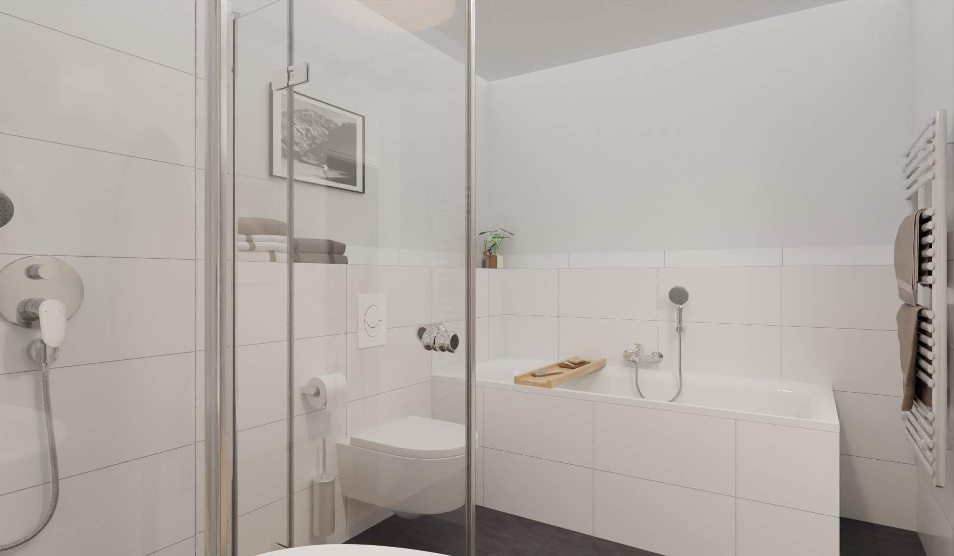 Modern gefliestes Badezimmer mit bodengleicher Dusche und Badewanne - 3 Zimmer Etagenwohnung in Germersheim