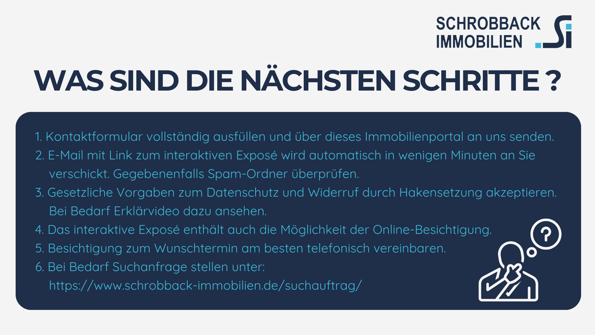 HINWEIS Unser Angebot entspricht nicht Ihren Vorstellungen? Dann teilen Sie uns Ihre Wünsche doch einfach über unsere Homepage mit. https://www.schrobback-immobilien.de/suchauftrag