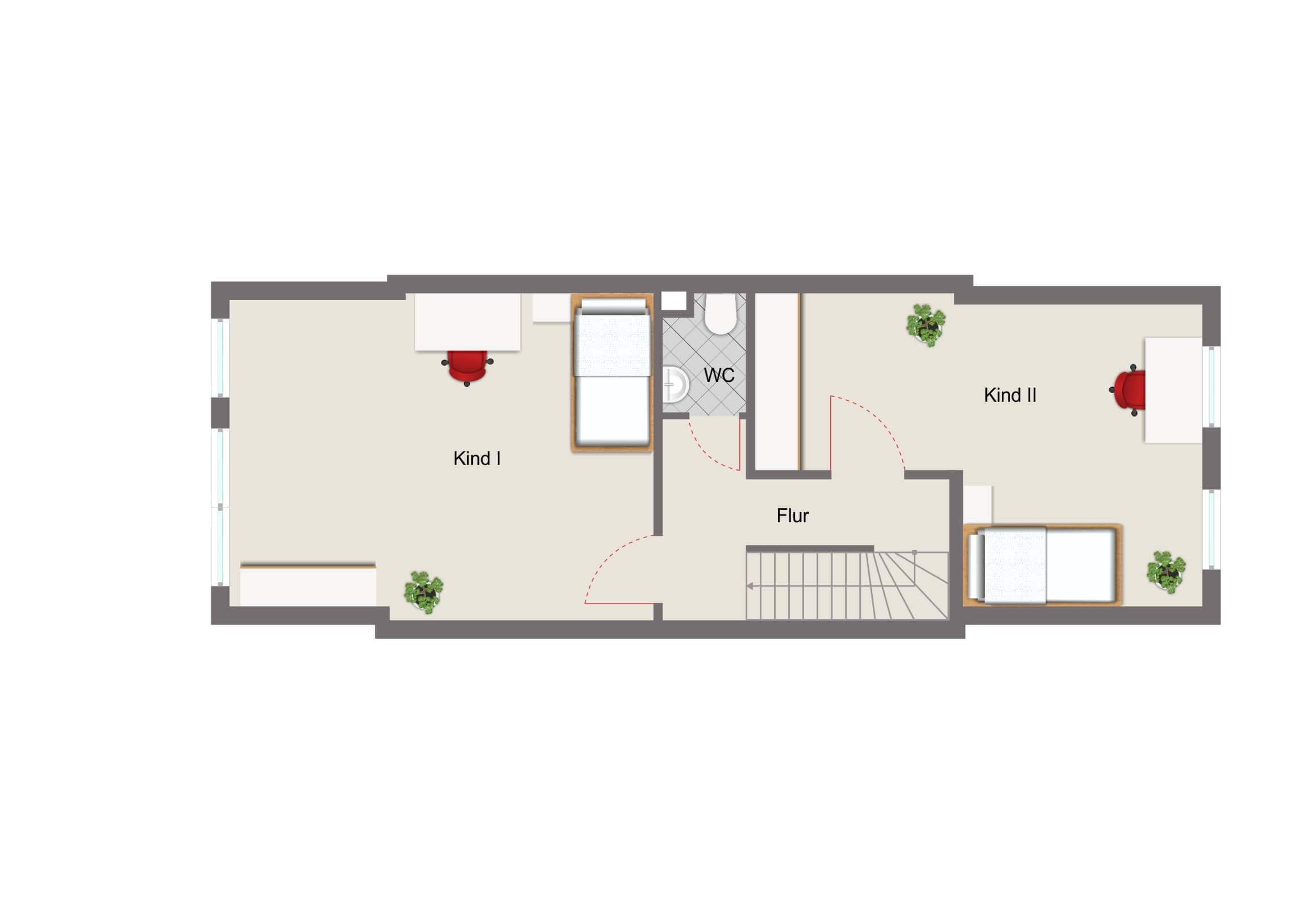 Im Obergeschoss erwarten Sie zwei vielseitig nutzbare Räume – ob als Schlafzimmer, Kinderzimmer oder Homeoffice, hier ist Platz für Ihre individuellen Bedürfnisse. Ein separates WC sowie der Zugang zum Balkon vom Schlafzimmer aus sorgen für zusätzlichen Komfort.