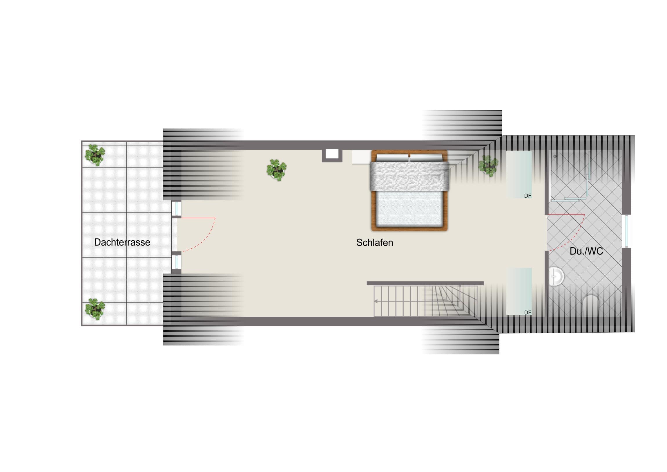 Das Dachgeschoss begeistert mit einem großzügigen, offenen Raum, der sich ideal als Wohn- und Schlafbereich eignet. Ein weiteres Duschbad sowie die große, dachterrassenähnliche Fläche verleihen dieser Etage einen ganz besonderen Charakter.