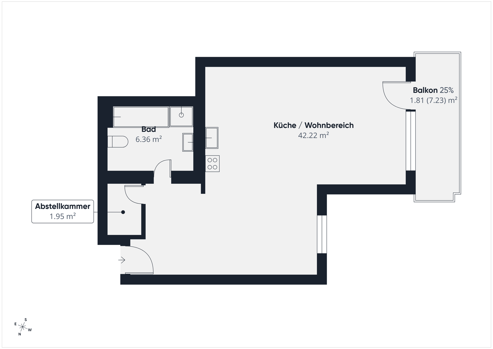 Die Einheit überzeugt durch einen großzügigen, offen gestalteten Hauptraum mit Kochbereich, ein Badezimmer sowie eine praktische Abstellkammer. Der Hauptraum ist dank großformatiger Fensterflächen und der Südwest-Ausrichtung angenehm hell und freundlich. Von hier aus besteht direkter Zugang zum Balkon, der ausreichend Platz für eine Sonnenliege oder einen Tisch mit Stühlen bietet und zum Entspannten einlädt. Das Badezimmer verfügt über eine Badewanne, eine separate Duschkabine sowie einen Waschmaschinenstellplatz. Die zusätzliche Abstellkammer innerhalb der Wohnung sorgt für wertvollen Stauraum und unterstützt eine klare, aufgeräumte Raumstruktur.