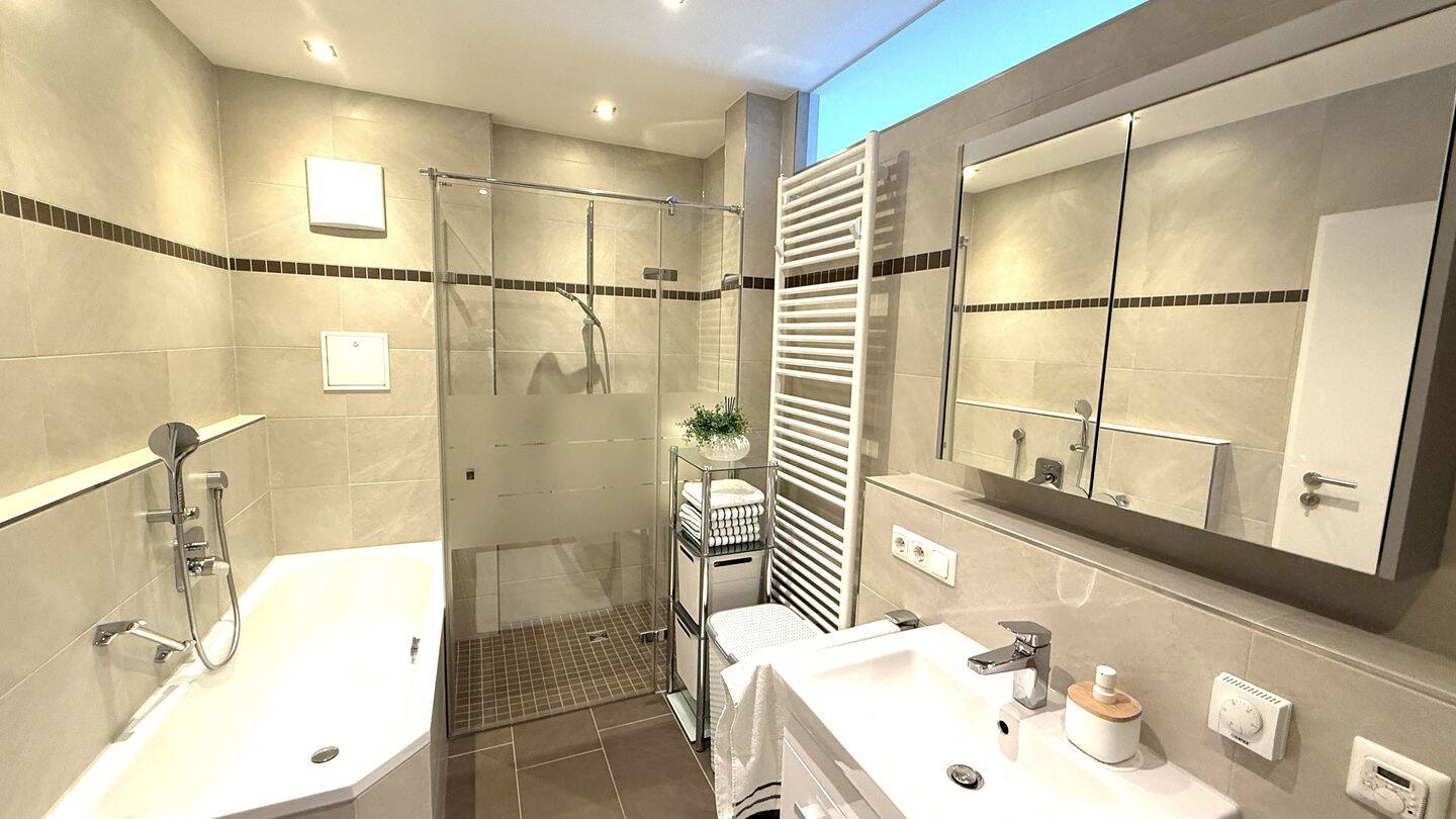 modernes Bad mit Badewanne und Dusche -