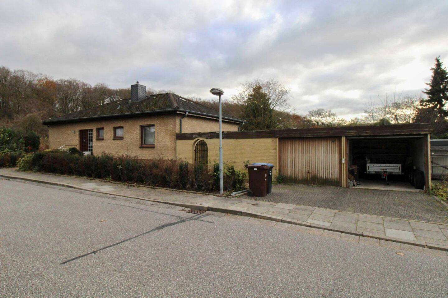 • Straßenansicht mit Doppelgarage - Einfamilienhaus mit Vollkeller und Sauna in Altenholz-Klausdorf - renovierungsbedürftig