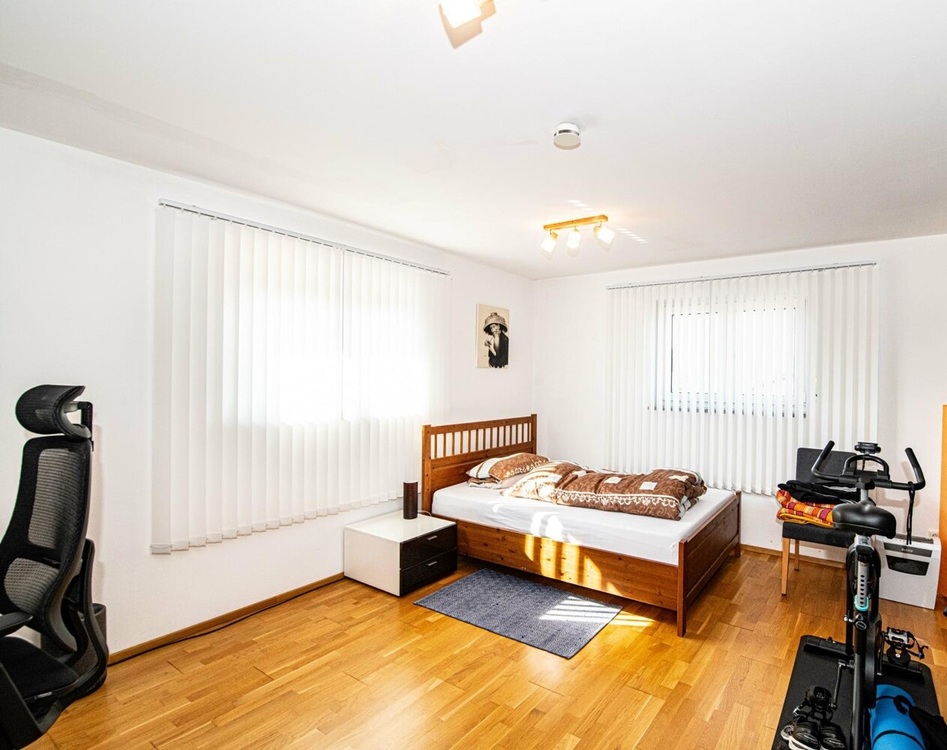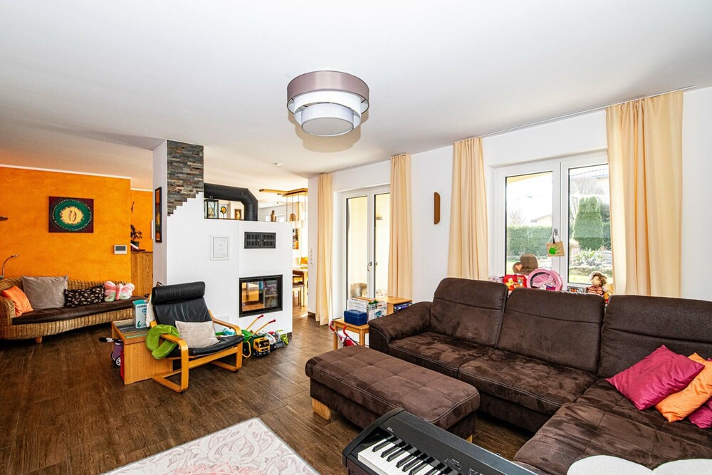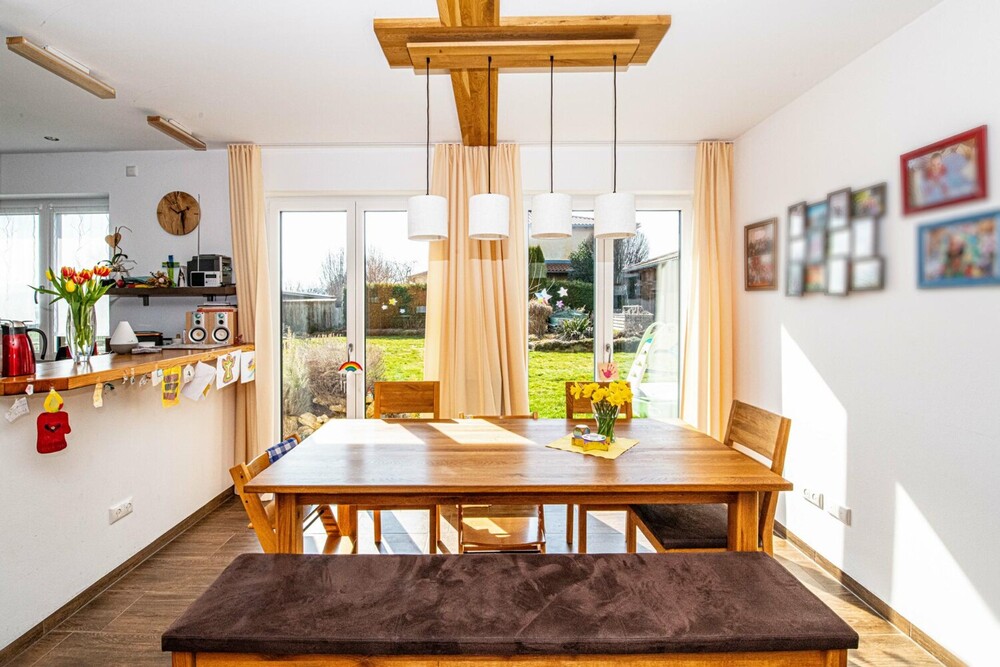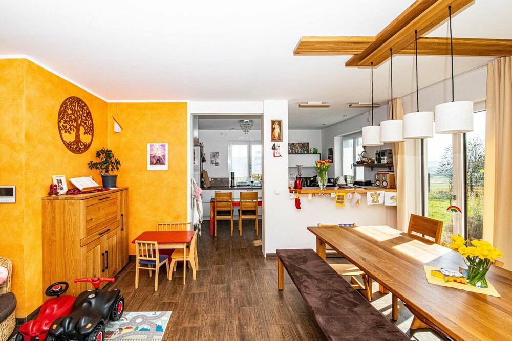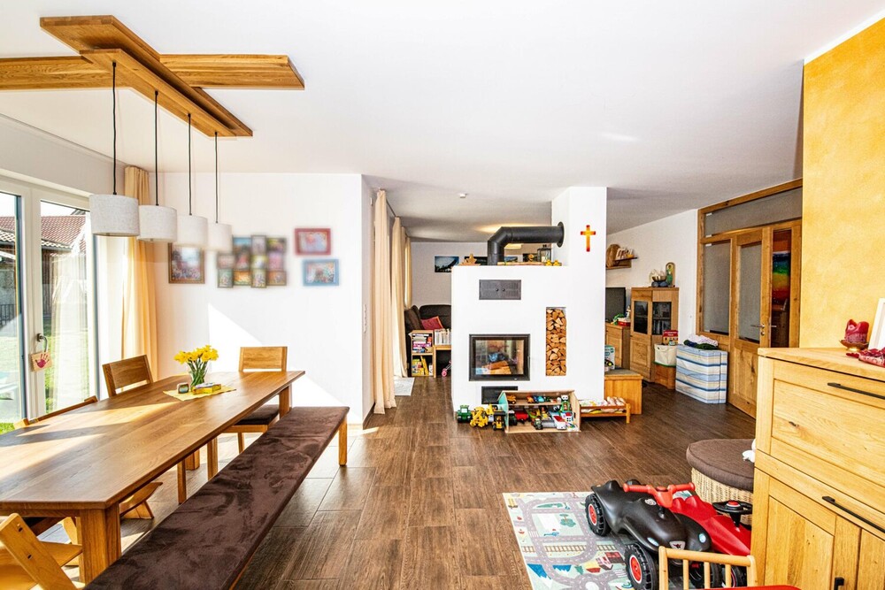 Das Haus verfügt insgesamt über fünf Zimmer, davon vier Schlafzimmer. Der offen gestaltete Wohn- und Essbereich im Erdgeschoss ist das zentrale Herzstück der Immobilie. Von hier aus gelangt man direkt auf die überdachte Terrasse und in den Garten. Ein Kachelofen mit integriertem Wärmetauscher sorgt an kühleren Tagen für behagliche Wärme und unterstützt das effiziente Heizsystem der modernen Fußbodenheizung.