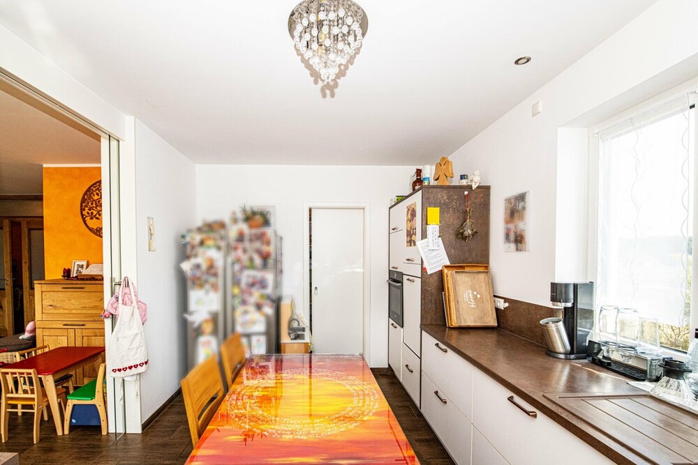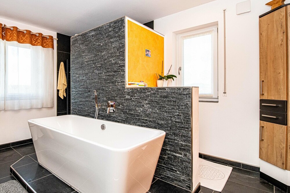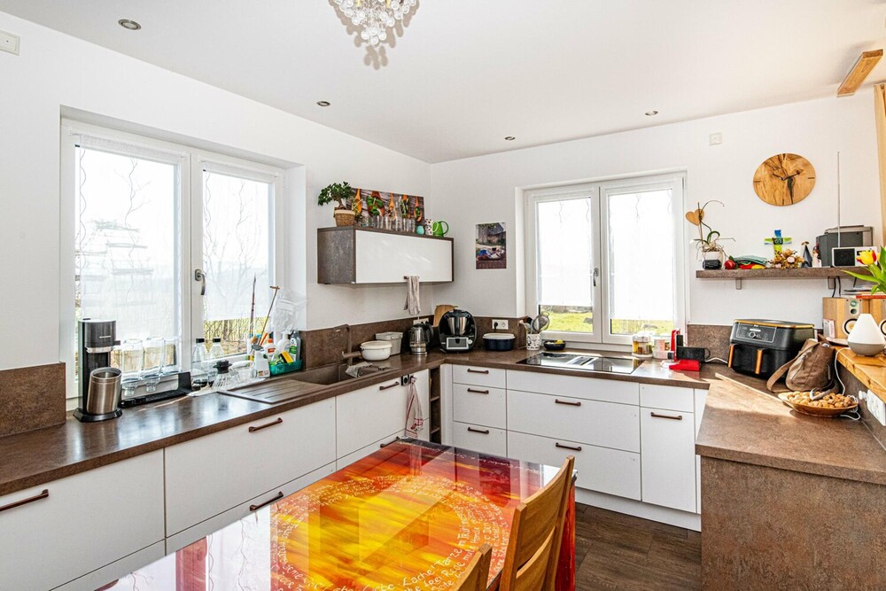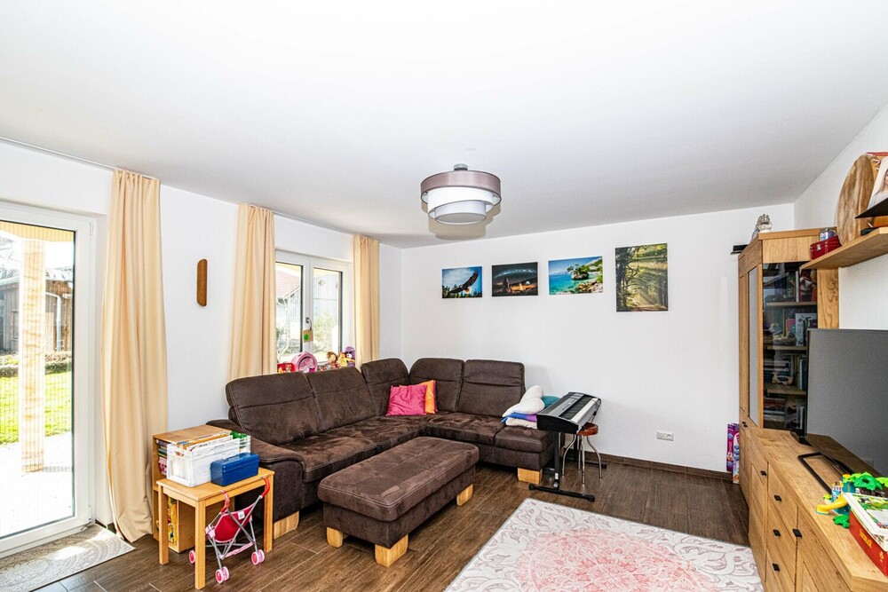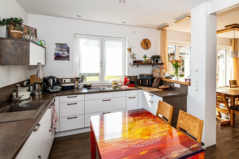 Das Haus verfügt insgesamt über fünf Zimmer, davon vier Schlafzimmer. Der offen gestaltete Wohn- und Essbereich im Erdgeschoss ist das zentrale Herzstück der Immobilie. Von hier aus gelangt man direkt auf die überdachte Terrasse und in den Garten. Ein Kachelofen mit integriertem Wärmetauscher sorgt an kühleren Tagen für behagliche Wärme und unterstützt das effiziente Heizsystem der modernen Fußbodenheizung.