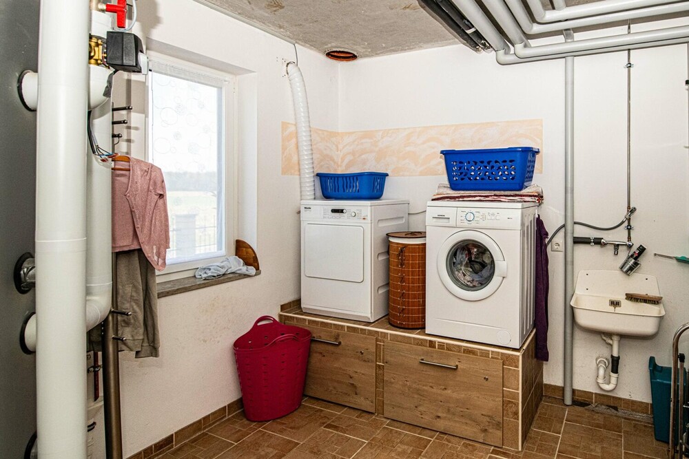 * Toskana Stil * 214 m² Wohnfläche * 1.183 m² Grundstück * überdachte Terrasse * Regenwasserzisterne * Fernwärme mit Biogas * Schuppen mit Erdkeller 49 m² * 5 Zimmer – Raum für die ganze Familie * Kachelofen mit Wärmetauscher zur Heizung * Doppelgarage mit Durchfahrt zum Garten 56 m² * Wäscheabwurfschacht im Bad direkt zur Waschmaschine