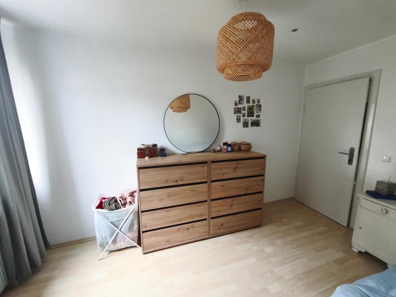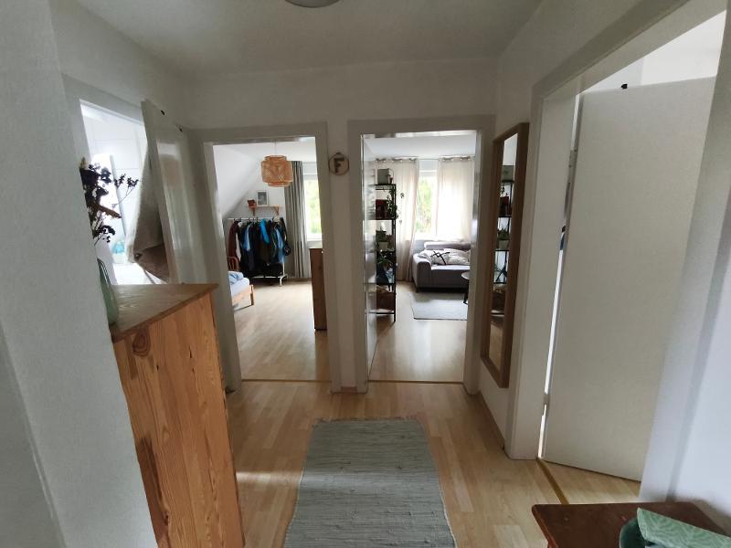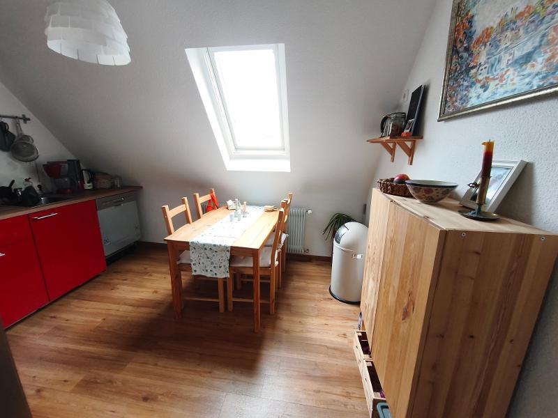 Die gepflegte Wohnung liegt im Dachgeschoss (2. Obergeschoss) eines Mehrparteienhauses. Die Wohnung verfügt über einen Flur, eine Küche mit ausreichend Platz für einen Esstisch, ein Bad (mit Fenster, Dusche und Waschmaschinenanschluss), ein Wohnzimmer, ein Schlafzimmer und ein Arbeitszimmer. Die Wohnung wird ohne Küche vermietet, es kann aber von der Vormieterin eine Küche (in Teilen) abgelöst werden. Zur Wohnung gehört ein Außenstellplatz. Ein Garten ist zur Mitbenutzung vorhanden.