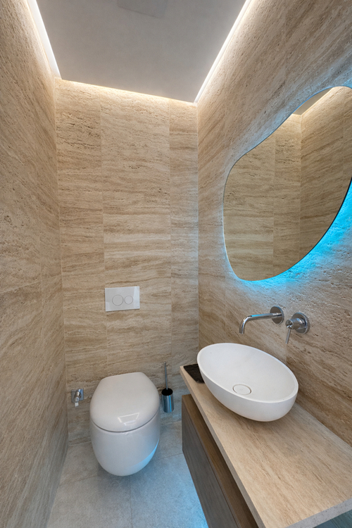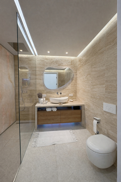 Ein weiteres besonderes Highlight ist das exklusiv ausgestattete Badezimmer. Hinterleuchtete Onyxplatten, fein inszenierte Ambientebeleuchtung und hochwertige Armaturen verleihen diesem Raum eine außergewöhnlich stilvolle Ausstrahlung und schaffen eine Atmosphäre von besonderer Eleganz und Ruhe. Ein praktischer Abstellraum ergänzt den hohen Wohnkomfort auf diskrete und zugleich äußerst sinnvolle Weise.
