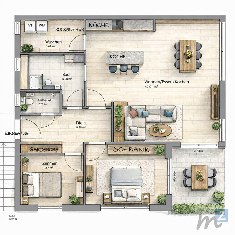 Eine Gewähr für die Richtigkeit sämtlicher im Exposé enthaltener Angaben und Abmessungen wird trotz sorgfältiger Bearbeitung von Daten, Bildern und Informationen nicht übernommen.