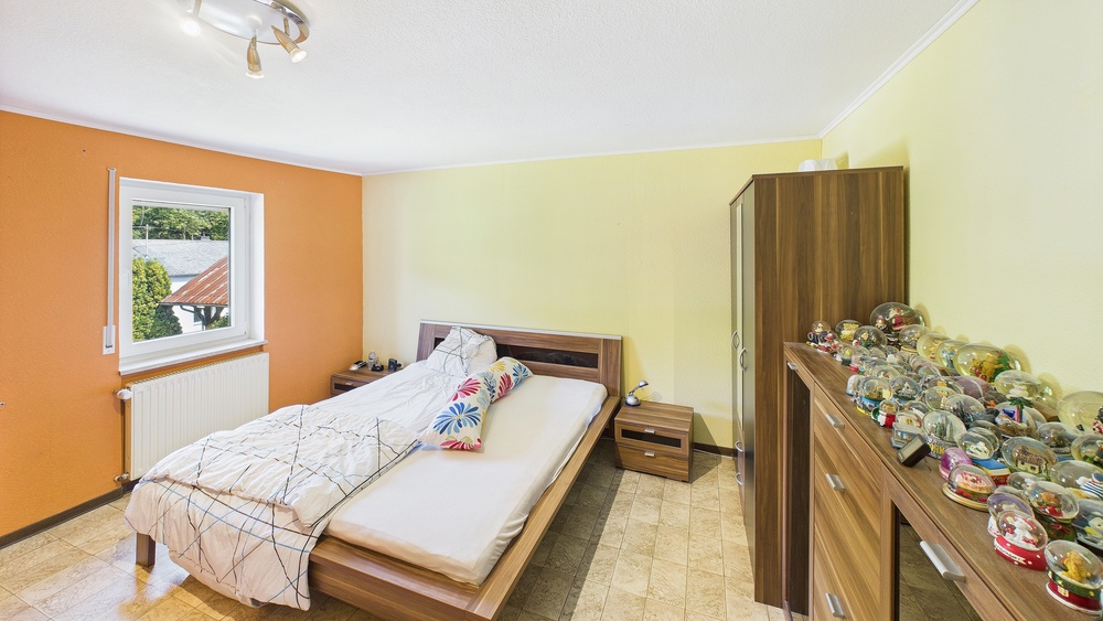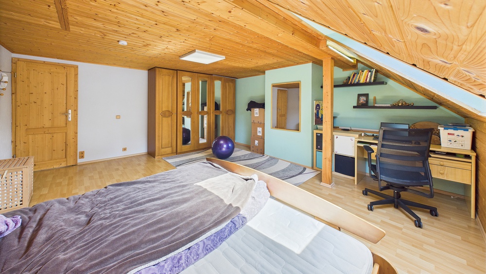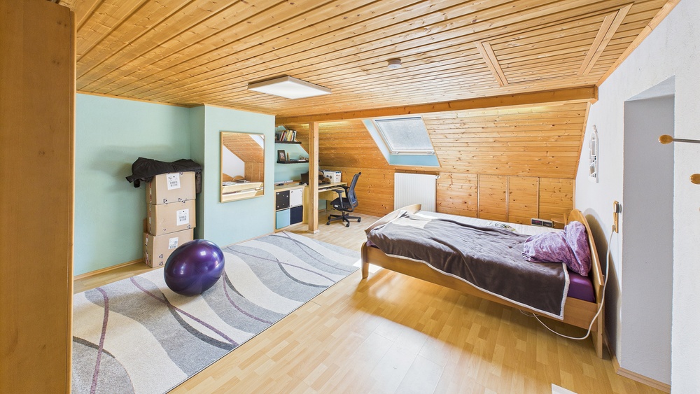 EG: Diele, Küche, Speisekammer, großes Wohnzimmer mit Ofen, Gäste-WC, Nebenräume . OG: Mehrere Schlafzimmer, großes Bad mit Wanne und Dusche, Zugang zu Balkon/Terrasse; Zwischentür zur Teilung in zwei Wohneinheiten; außerdem ein weiteres Schlafzimmer mit direktem Badezimmer (Fenster, Dusche, WC). DG: zusätzl. Wohn-/Schlafräume, Duschbad (Einliegerwohnungs-Charakter; separater Zugang möglich).