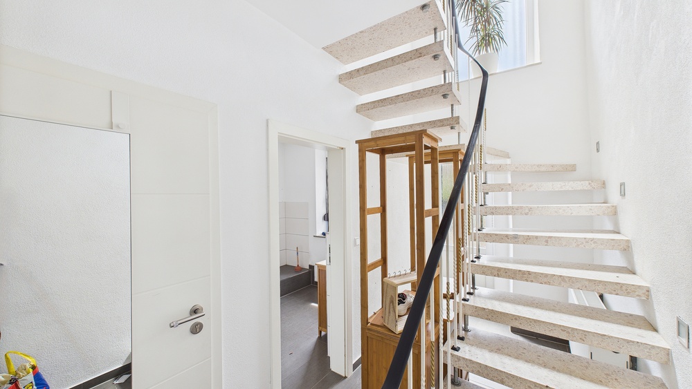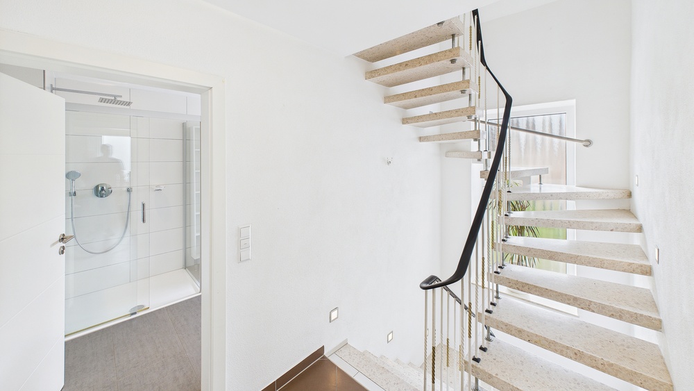 Hochwertig gestaltetes Treppenhaus mit indirekter Beleuchtung
