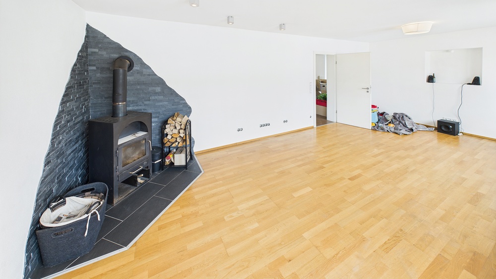 Weitläufiges Wohnzimmer mit gemütlichem Ofen, Parkett- und Fliesenboden