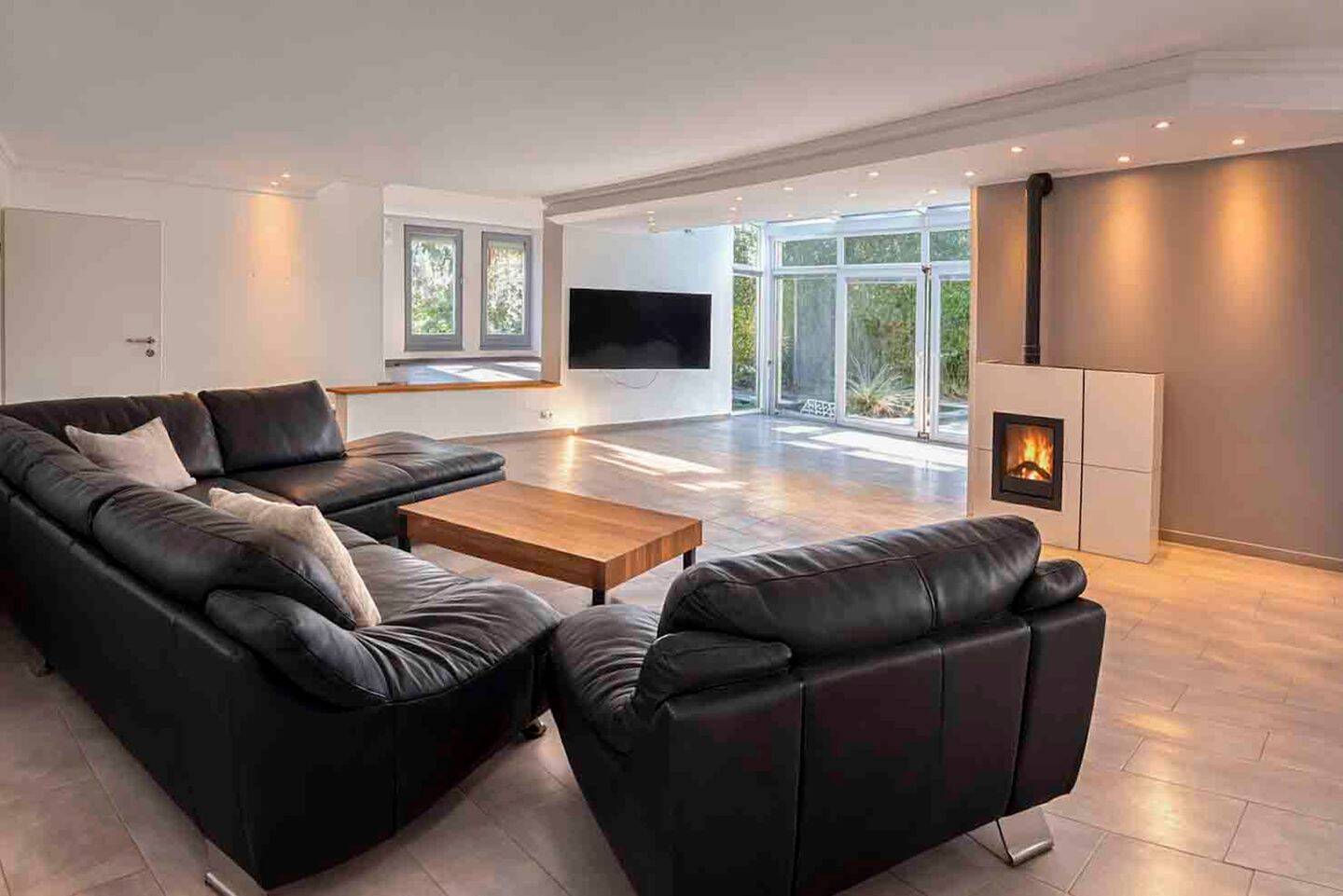 • Offener Wohnbereich mit Kamin und großer Fensterfront -