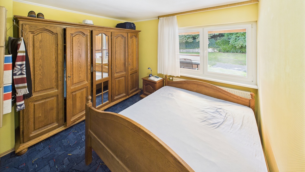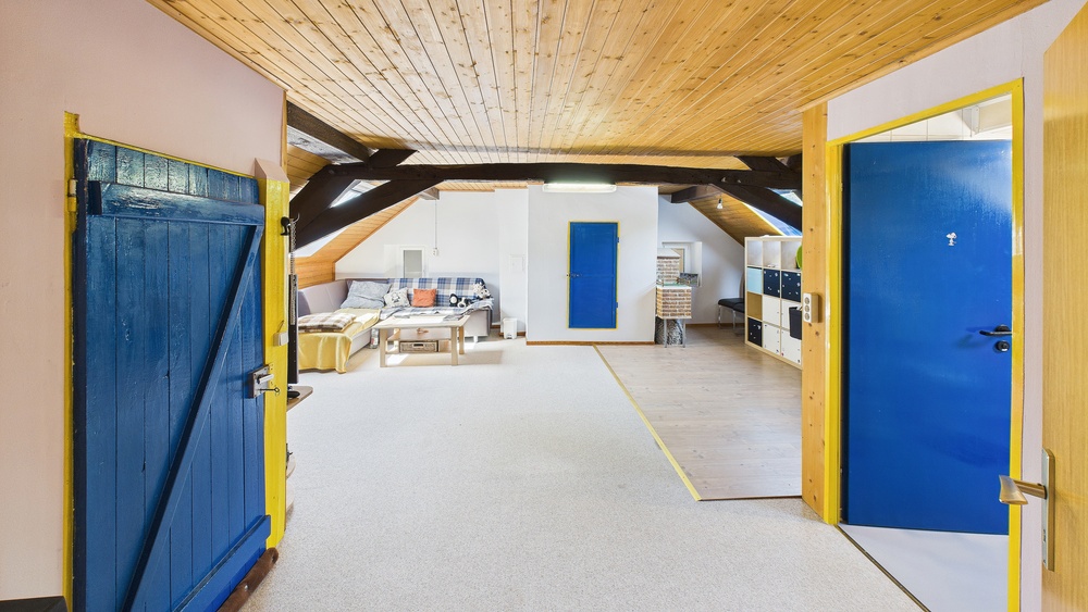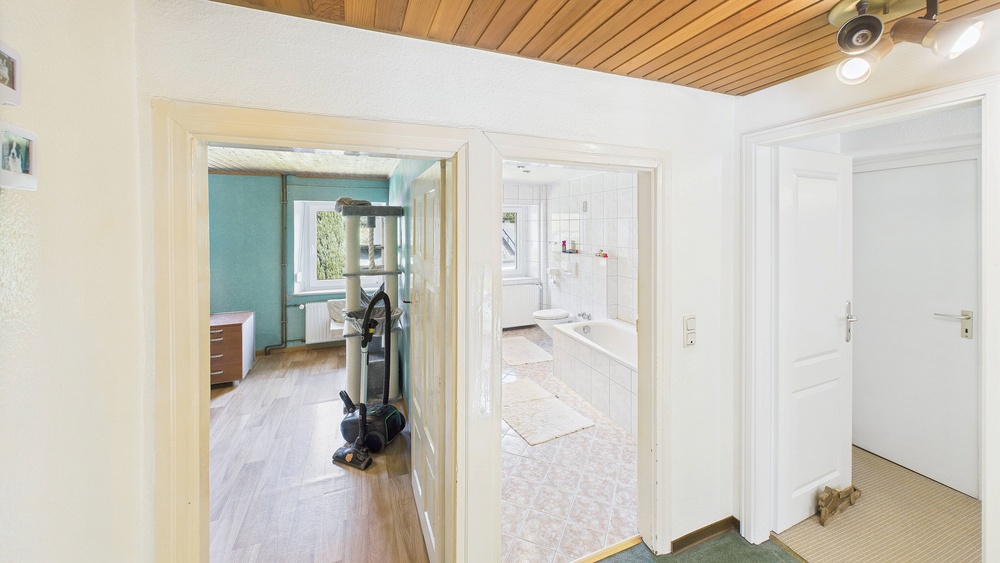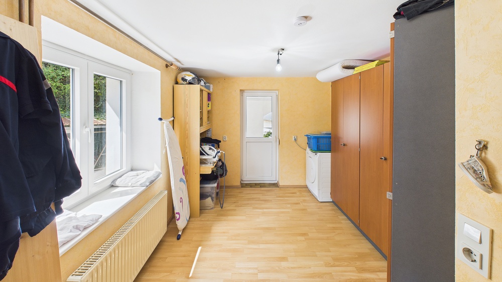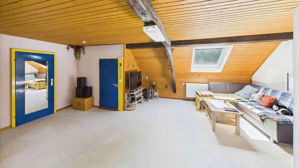 EG: Diele, Küche, Speisekammer, großes Wohnzimmer mit Ofen, Gäste-WC, Nebenräume . OG: Mehrere Schlafzimmer, großes Bad mit Wanne und Dusche, Zugang zu Balkon/Terrasse; Zwischentür zur Teilung in zwei Wohneinheiten; außerdem ein weiteres Schlafzimmer mit direktem Badezimmer (Fenster, Dusche, WC). DG: zusätzl. Wohn-/Schlafräume, Duschbad (Einliegerwohnungs-Charakter; separater Zugang möglich).