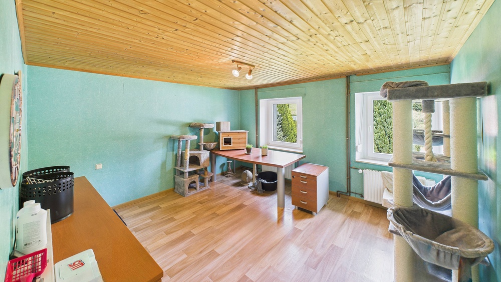 Das Nebengebäude ist vermutlich älter als 1884 (Jahresgravuren im Keller des ehemaligen Sägewerks). Es war zuerst Standort des ersten Elektrizitätswerks in Mettendorf (Anschlussspuren noch sichtbar) und diente später als Sägewerk mit erhaltener Transmissionsanlage (Seil-/Flachriemen) und Sägegatter. Befahrbar mit Carport-Charakter: Traktor/Anhänger lassen sich bequem unterstellen, der Durchgang zum ehemaligen Sägewerk und zu den Pferde-/Unterstellbereichen bleibt frei; unter der Halle zusätzlicher wettergeschützter Platz für Maschinen und Anhänger. Das Dach des Nebengebäudes wurde 2020 erneuert.