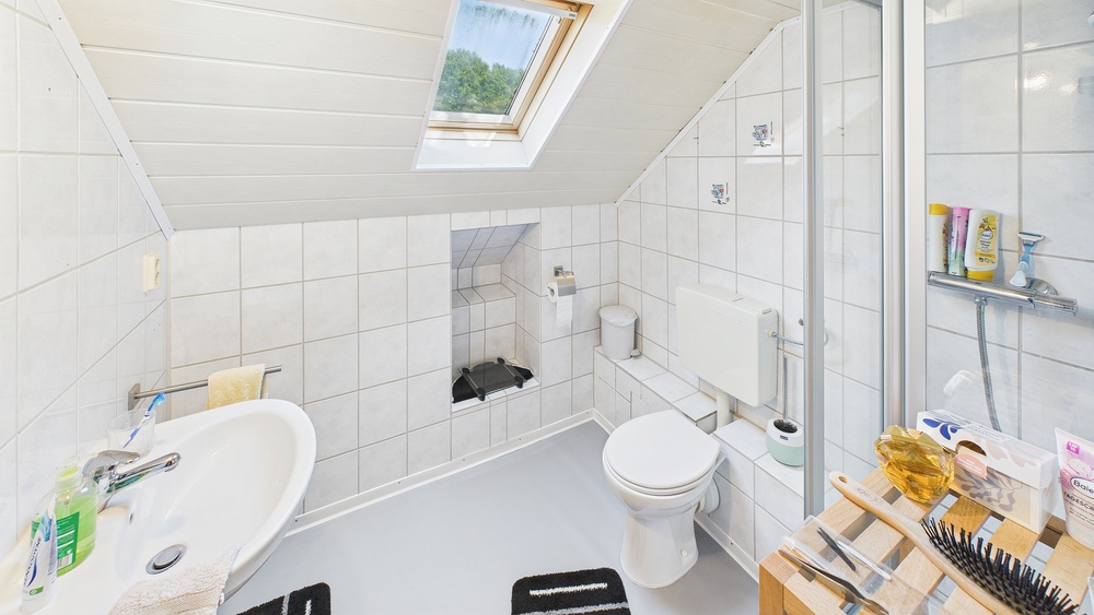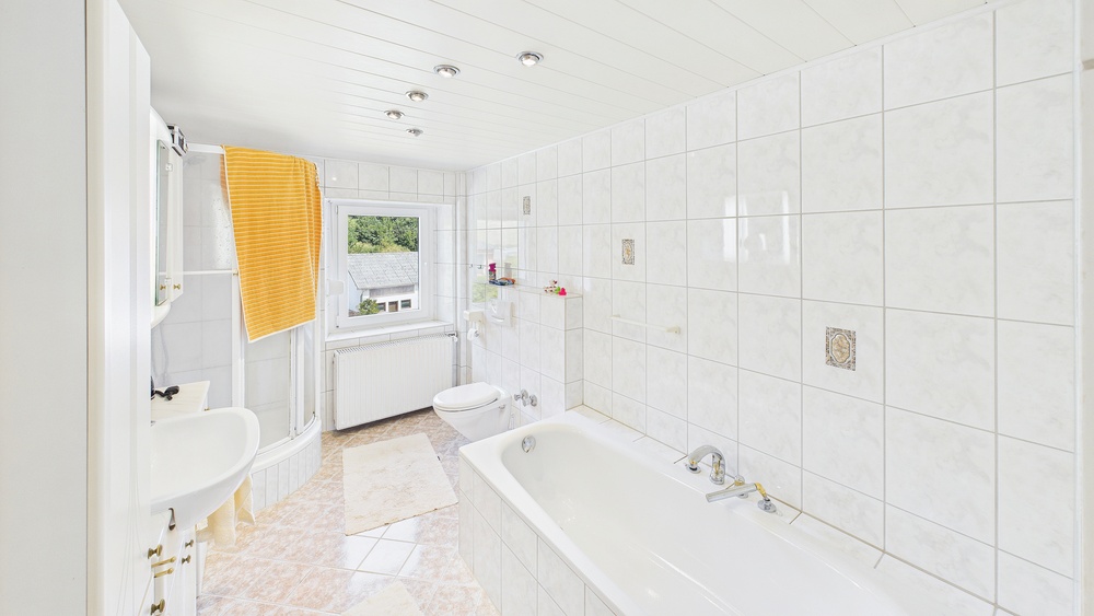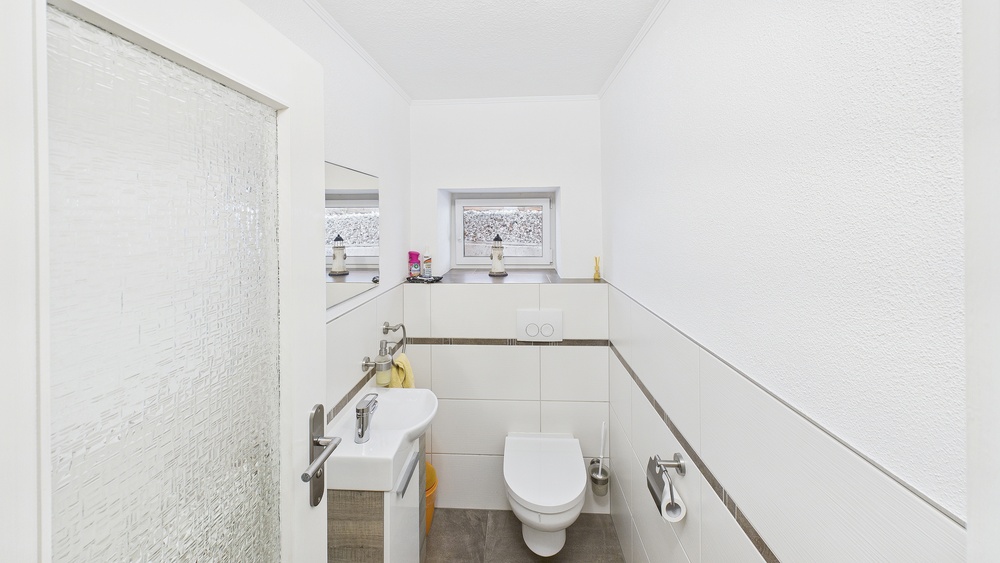 Insgesamt 3 moderne Bäder plus Gäste-WC (hell gefliest, gepflegt, zeitgemäß).