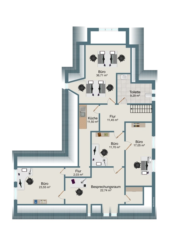 Im Dachgeschoss des gepflegten Geschäftshauses, befinden sich Ihre neuen Büro-/Praxisräume. Neben einem Empfang haben Sie die Möglichkeit die Räume in 3 Büros und ein Besprechungszimmer aufzuteilen. Die Größe der Büros lässt es zu, dass mehrere Arbeitsplätze in jedem Raum unter kommen können. Große Fenster lassen viel Licht herein, das macht eine gute Atmoshäre für Alle.