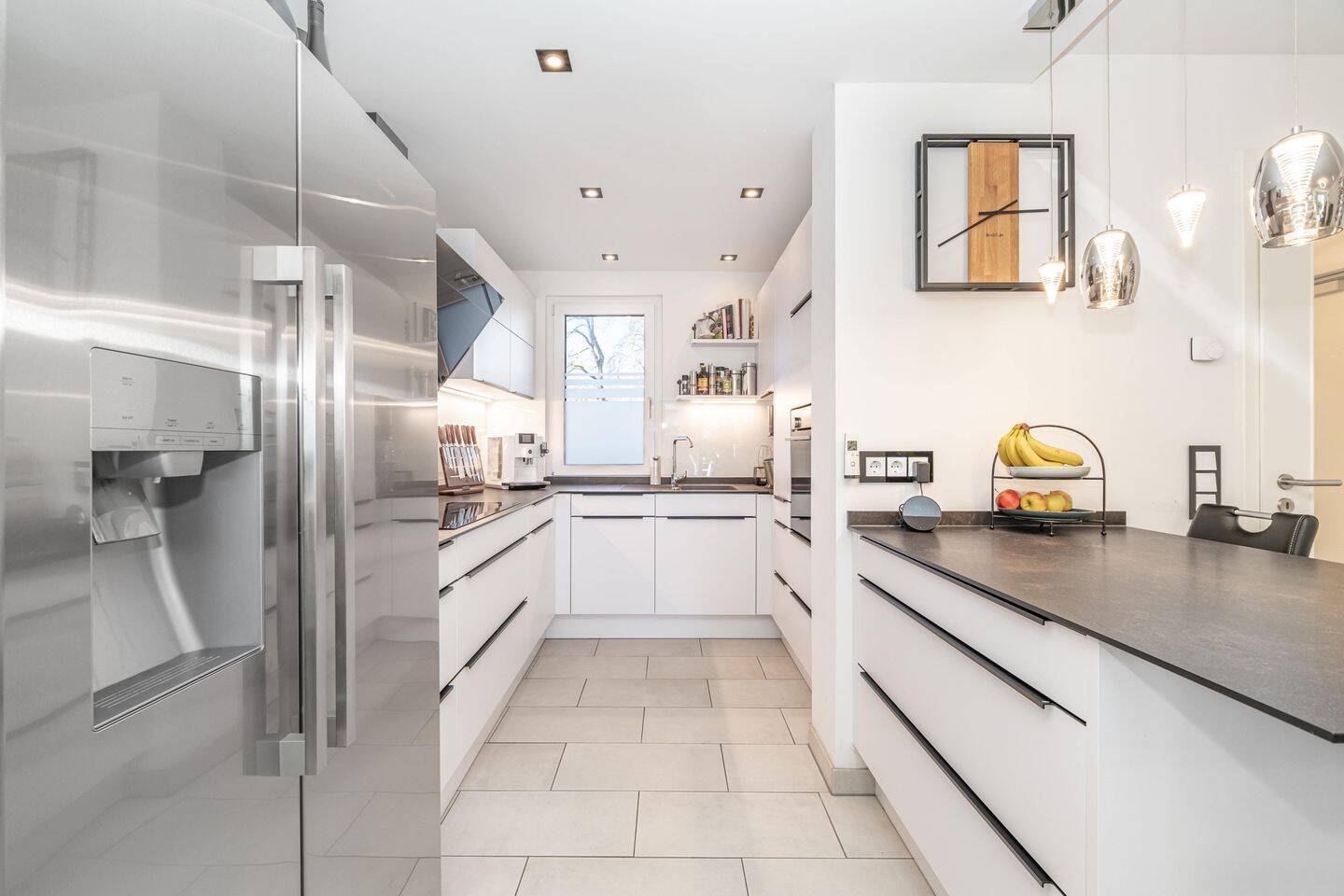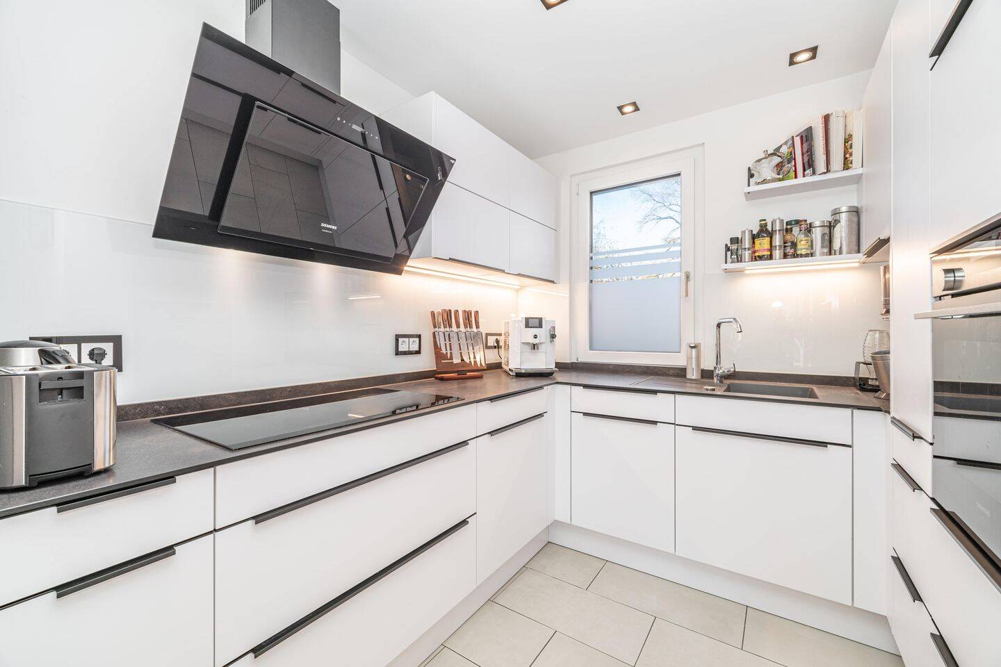 • Küche mit Fenster und Einbauten -