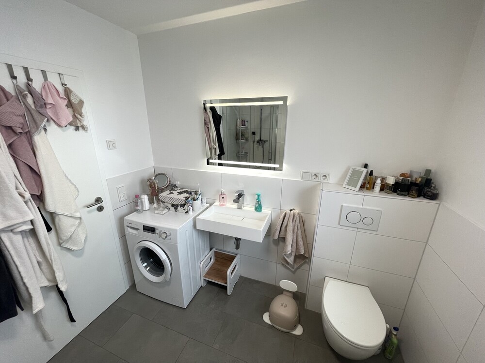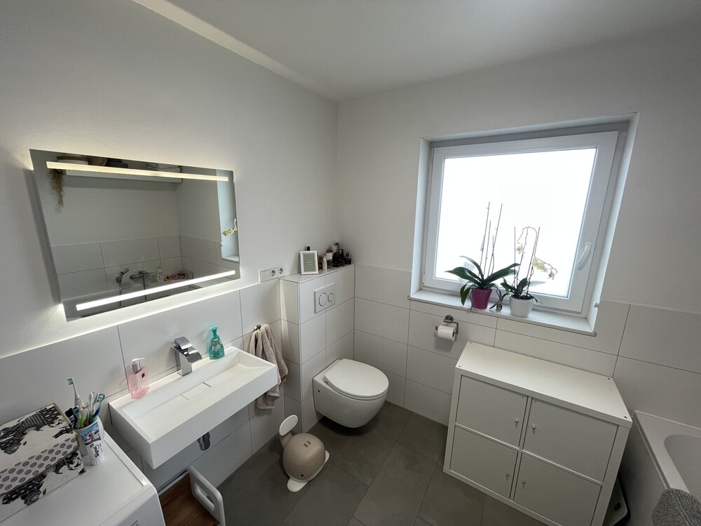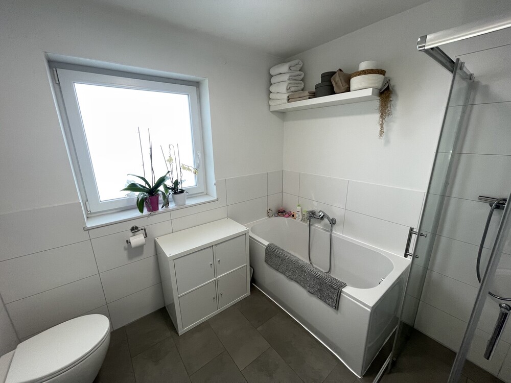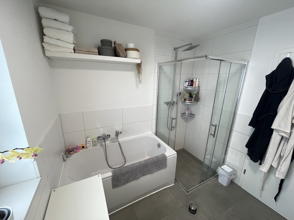 Das Badezimmer ist modern gestaltet und verfügt sowohl über eine Dusche als auch über eine Badewanne. Für ein angenehmes Wohnklima sorgt die in der gesamten Wohnung verlegte Fußbodenheizung.