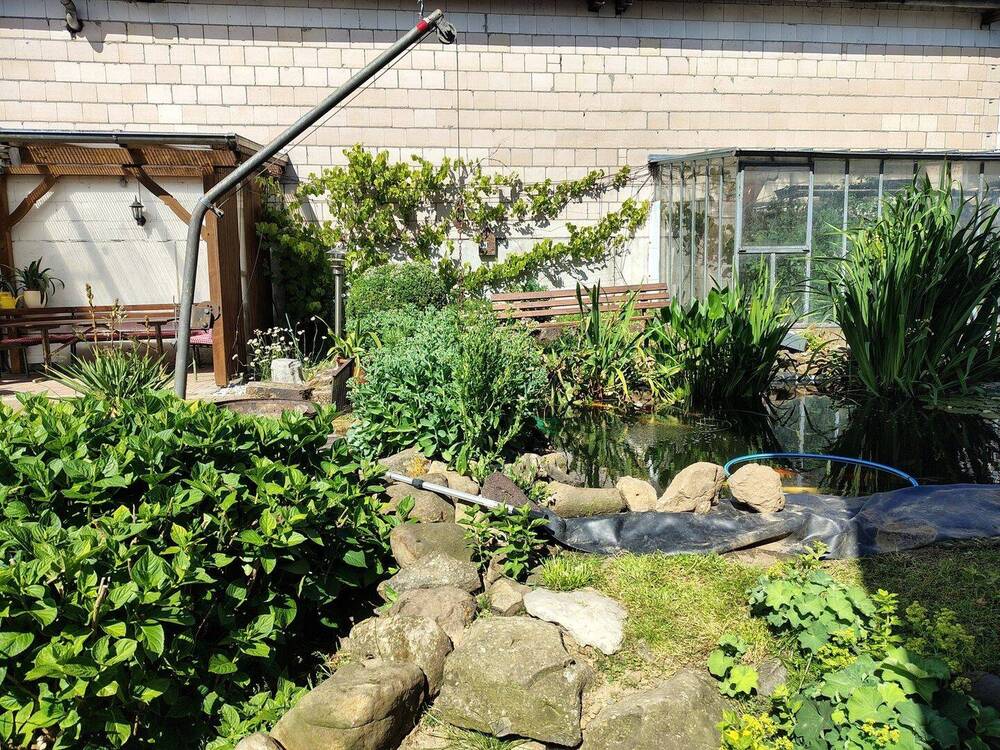 • Teich und Gewächshaus im Garten -