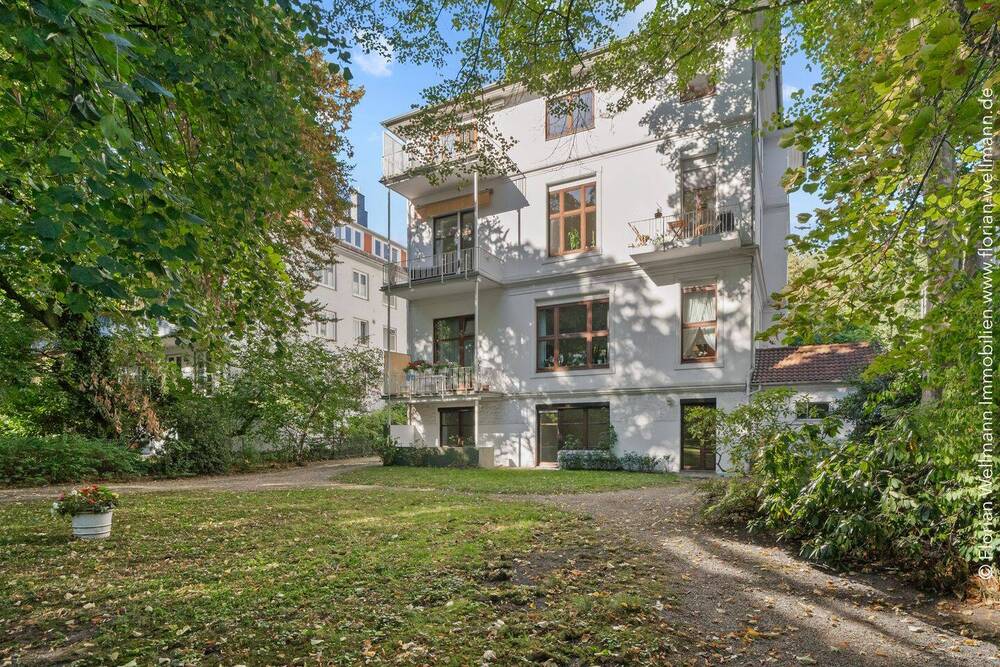 • Blick aus dem parkähnlichen Garten auf die Rückseite des Hauses. -