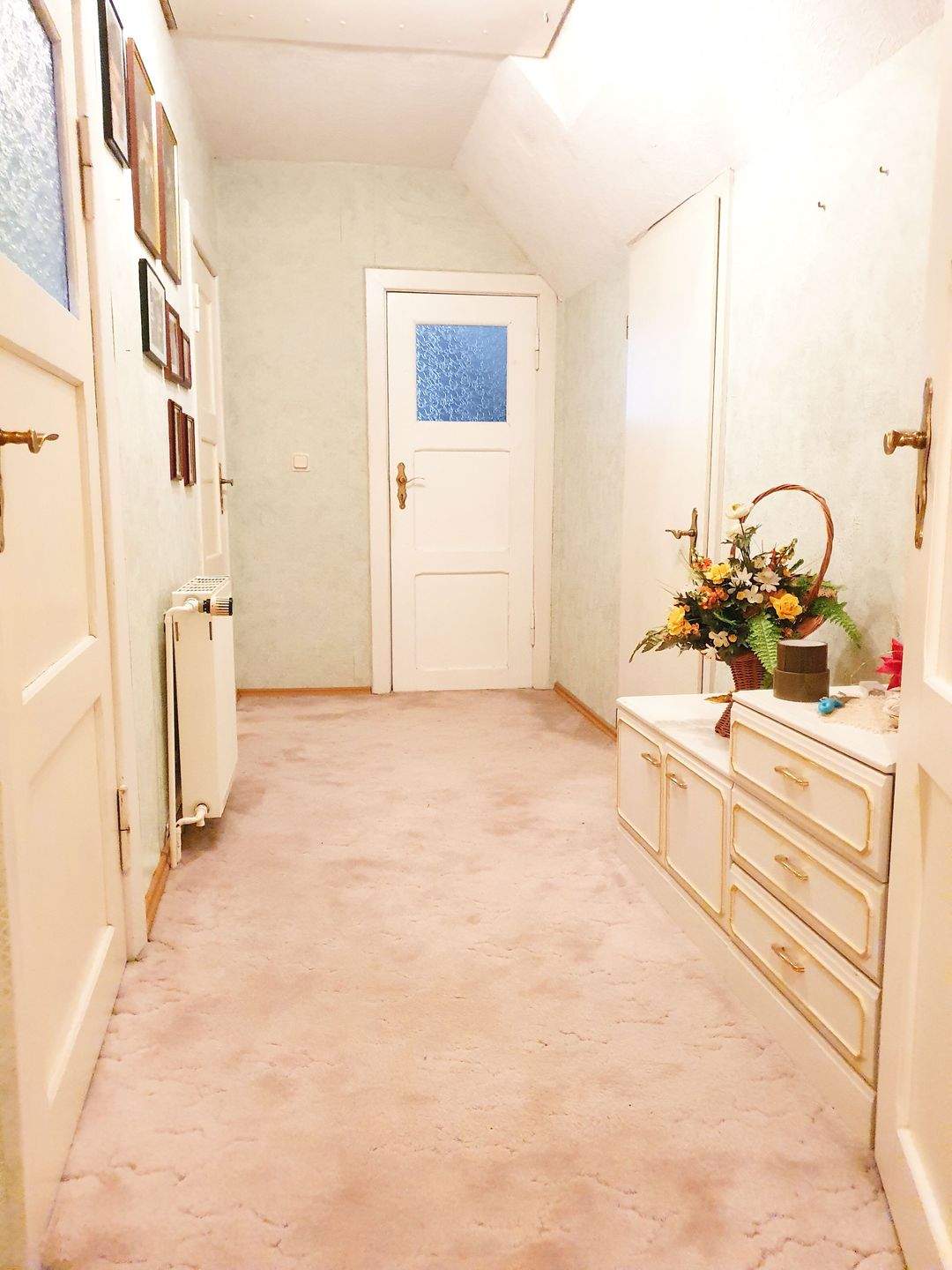 Beim Betreten des Hauses gelangen Sie zunächst in die Diele und von dort in den Flur. Vom Flur aus gehen Sie in die Küche und weiter in den Wohnbereich mit Wohnzimmer und angrenzendem Esszimmer. Das Gäste-WC befindet sich ebenfalls im Erdgeschoss und ist vom Flur aus zugänglich. Über die Treppe im Flur erreichen Sie das Dachgeschoss mit Badezimmer, Schlafzimmer und einem Kinderzimmer. Der Dachboden ist über eine Leiter zugänglich und nicht ausgebaut. Eine weitere Treppe führt vom Erdgeschoss in das Kellergeschoss. Dort befinden sich die Waschküche, der Heizungsraum, ein weiterer Kellerraum sowie der Zugang zur ins Haus integrierten Garage.