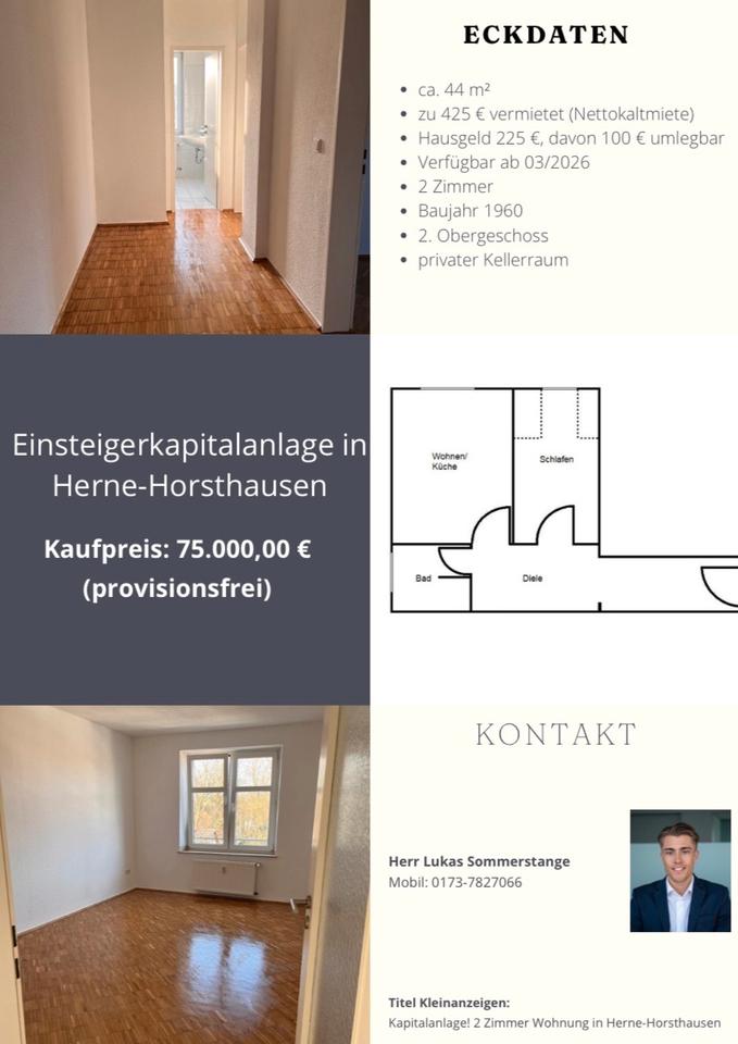 Sie befinden sich hier: Vermietete 2-Zi.-ETW - 44 m² - 425 € KM - provisionsfrei - Herne in Herne Sodingen - 3376954830-196-2006 | 1A-Immobilienmarkt.de