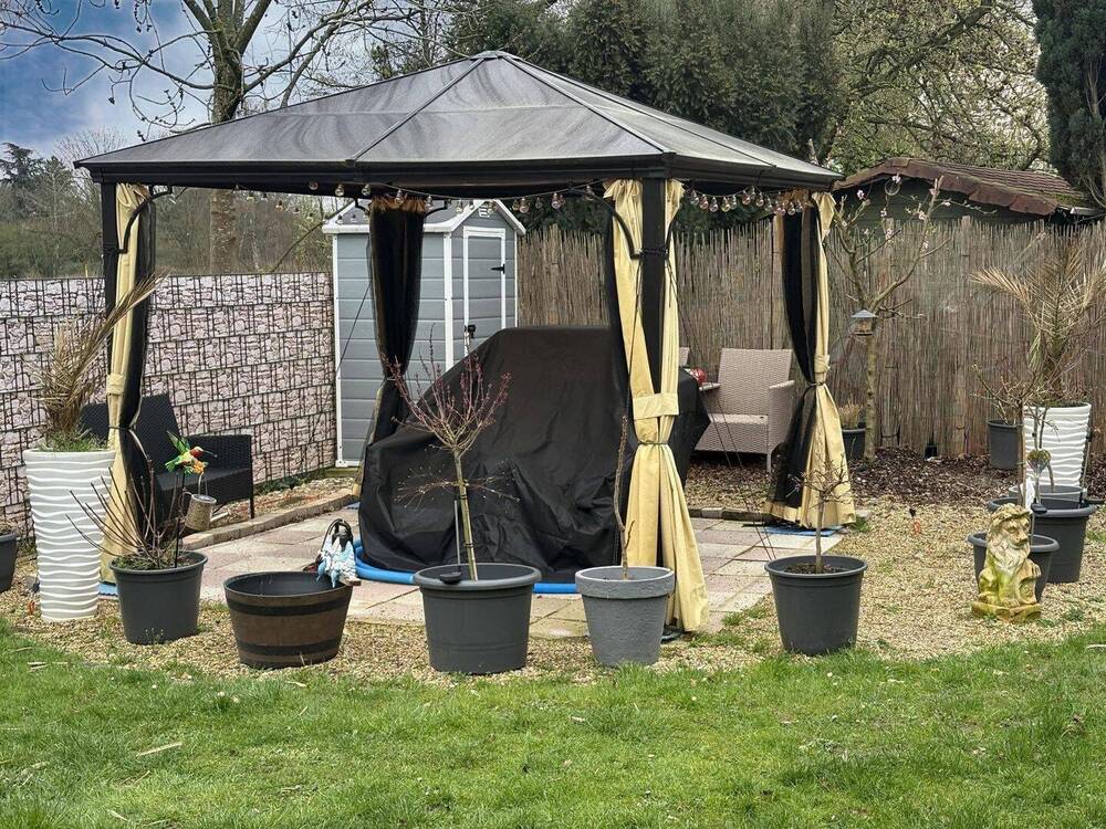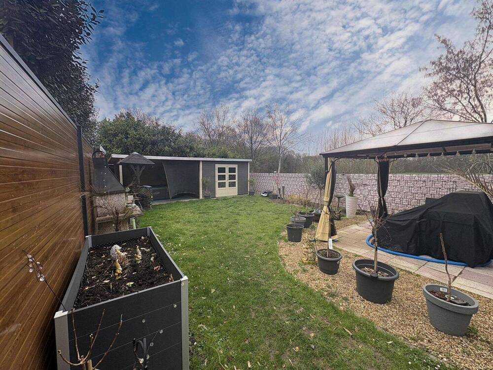• der eigene Garten mit Gartenhaus und überdachter Terrasse -