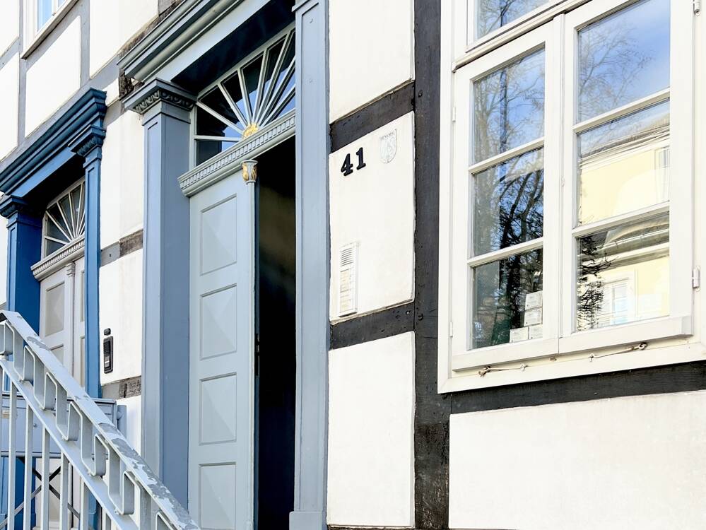 Schöne Fachwerkfassade + Hauseingang - Schöne Eigentumswohnung mit Dachterrasse im City-Fachwerk