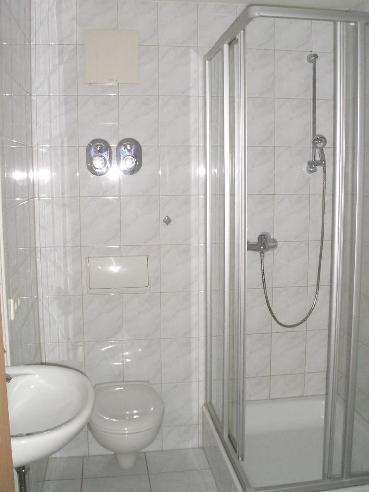 Die Wohnung ist in einem sehr guten, gepflegten Zustand. Die Böden des Wohn- und Schlafbereichs sind mit Laminat ausgelegt. Die Küche hat helle Bodenfliesen und einen Fliesenspiegel. Es ist eine Einbauküche mit Elektrogeräten eingebaut. Das Duschbad ist komplett mit weißen Fliesen, Hänge-WC, Waschtisch und großzügiger Dusche, ausgestattet. Im Bad befindet sich ebenfalls der Waschmaschinenanschluss. Die Wände der Wohnung sind mit Raufaser tapeziert und hell gestrichen.