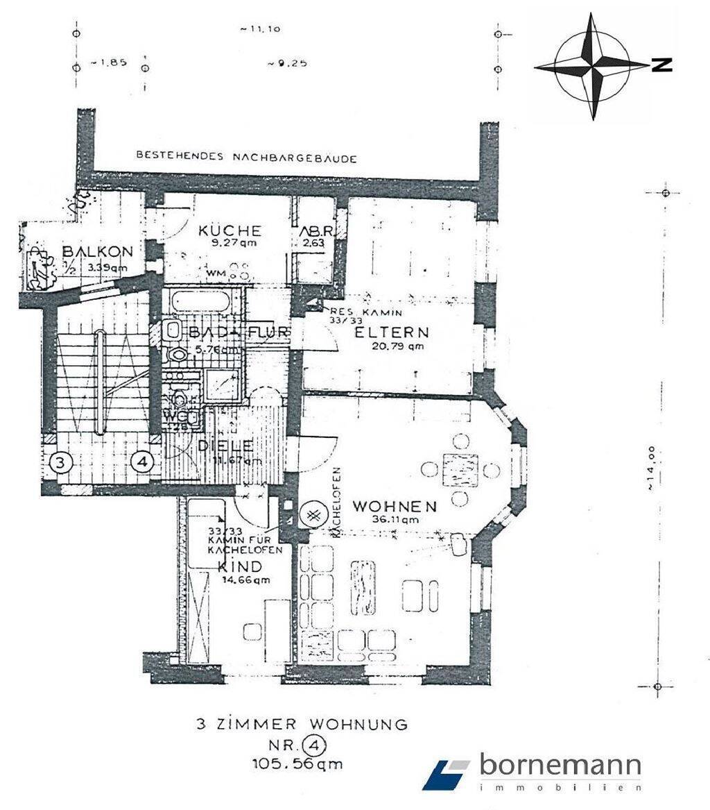Zimmeranzahl :3 Gesamtgröße :ca. 105,00 m² Wohnfläche :ca. 105,60 m² Baujahr :1911 Frei ab :01.06.2026 Etage :1 Balkon :