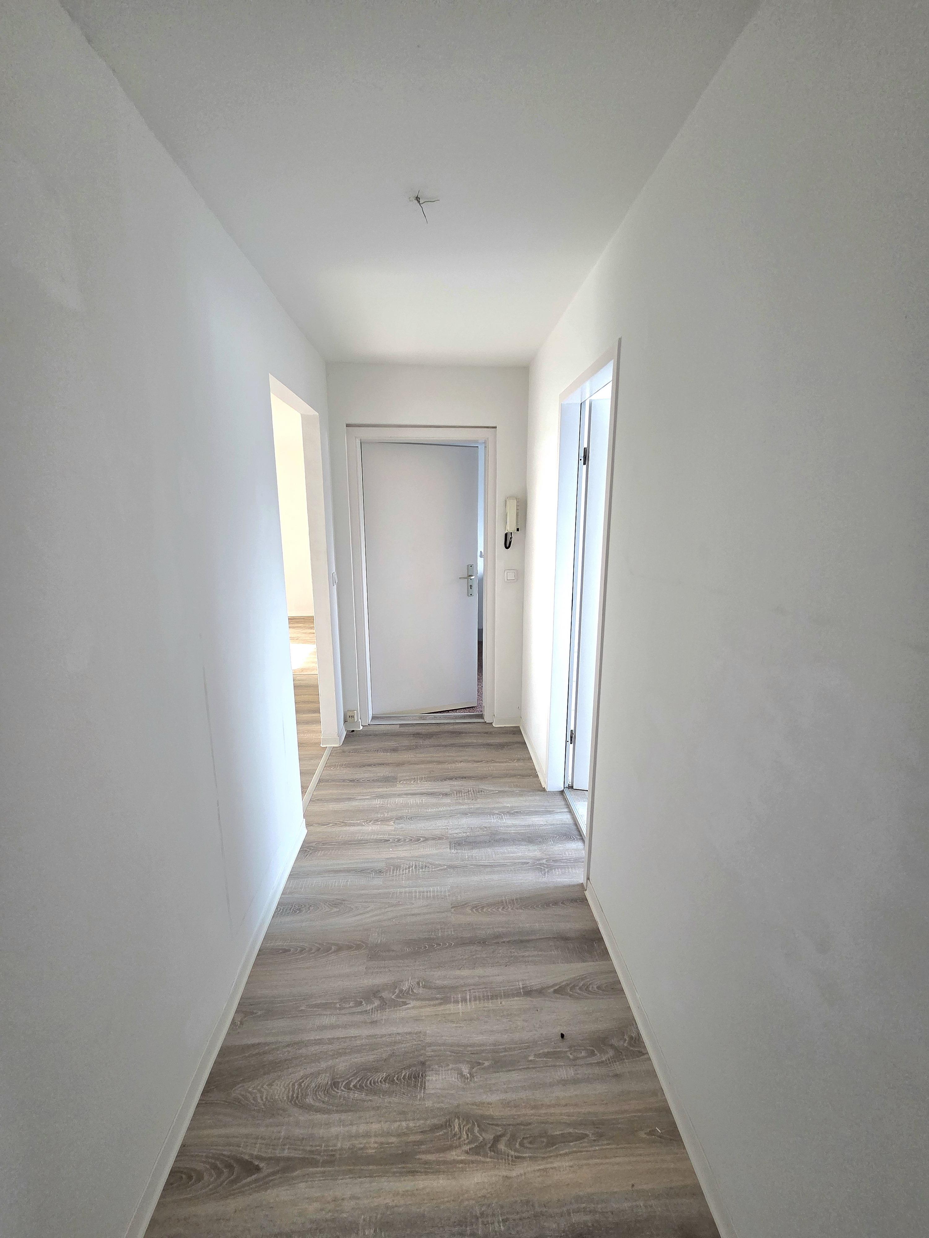 Der Laminatfußboden in Kombination mit weißen Türen verleiht den Räumen einen modernen und zugleich wohnlichen Charakter.