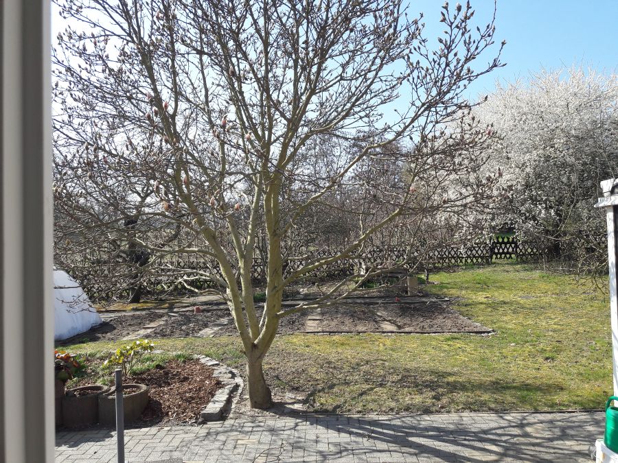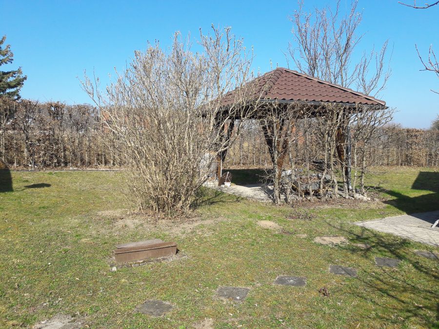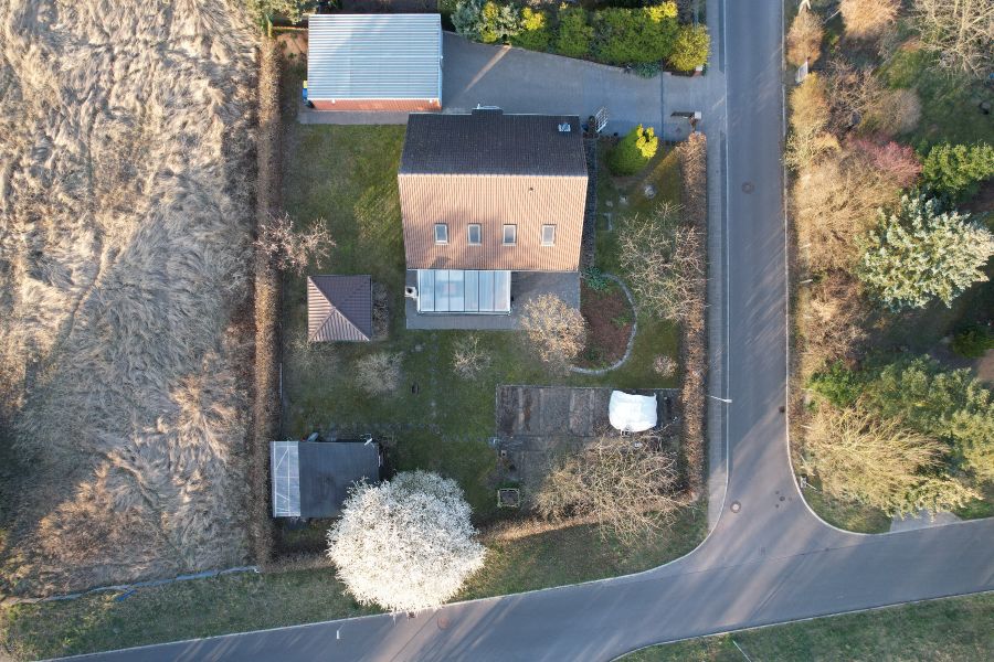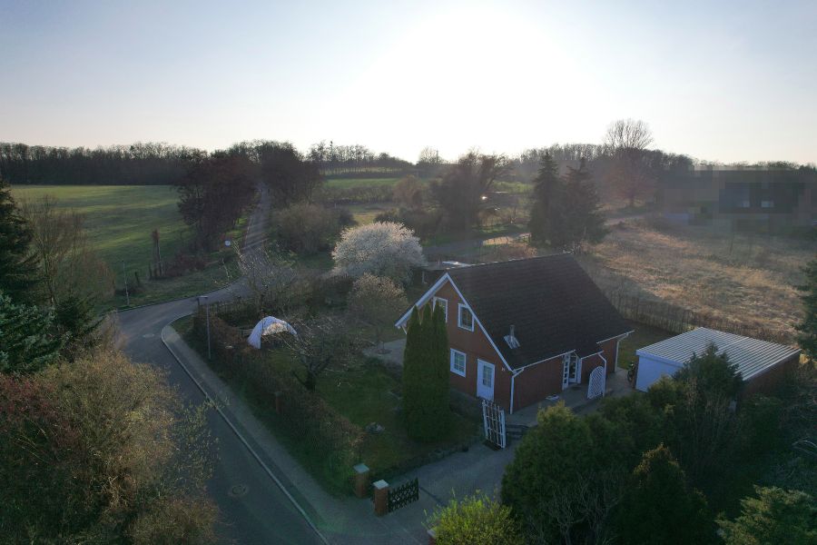 Neben dem Haupthaus umfasst das Grundstück einen gemauerten Gartenschuppen, der als Vorratsraum, Werkstatt und Lagerraum für Gartengeräte genutzt wurde. Weiterhin gibt es eine Doppelgarage, deren zusätzliche Räume im hinteren Teil weitere ebenerdige Abstellmöglichkeiten bieten. Für Gemütlichkeit sorgt die Pergola - ein vom benachbarten Tischler in Einzelanfertigung überdachter Grill- und Sitzplatz hinter dem Haus, der auch bei schlechterem Wetter den Ausblick auf den alten Obstbaumbestand erlaubt. Neben den Obstbäumen (Kirsche, Apfel, Pflaume, Aprikose) besteht der Garten aus einem kleinem Nutzgarten für den privaten Gemüseanbau sowie einer Blumeninsel direkt an der Terrasse. Eine Magnolie spendet dort ergiebigen Schatten. Umrandet wird der Garten durch eine dichte Hainbuchenhecke und einen kompett neu errichteten Lattenzaun aus Lärche und einem elektrischen Hoftor. Die Bewässerung des Gartens erfolgt über das Brauchwassernetz, über das auch die Landwirtschaft versorgt wird. Das Grundstück ist mit seinen 1.200 qm eines der letzten großen Grundstücke im bebauten Bereich, komplett Bauland, ggf. teilbar und hat nur einen direkten Nachbarn. Die Straße ist verkehrsberuhigt (30 kmh), was sicher auch zur Elternruhe beiträgt. Der am Haus vorbeiführende "Panoramaweg" erlaubt Spaziergänge und Radtouren durch die endlos erscheinenden Obstwiesen. Außerdem befindet sich in 200 m Entfernung das Naturschutz- und Naherholungsbebiet Erdeberge - eine ehemalige Lehmgrube, die der Versorgung der Glindower Ziegelei diente.