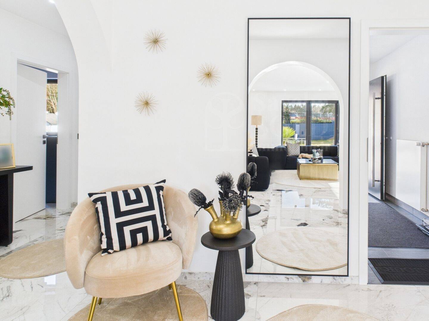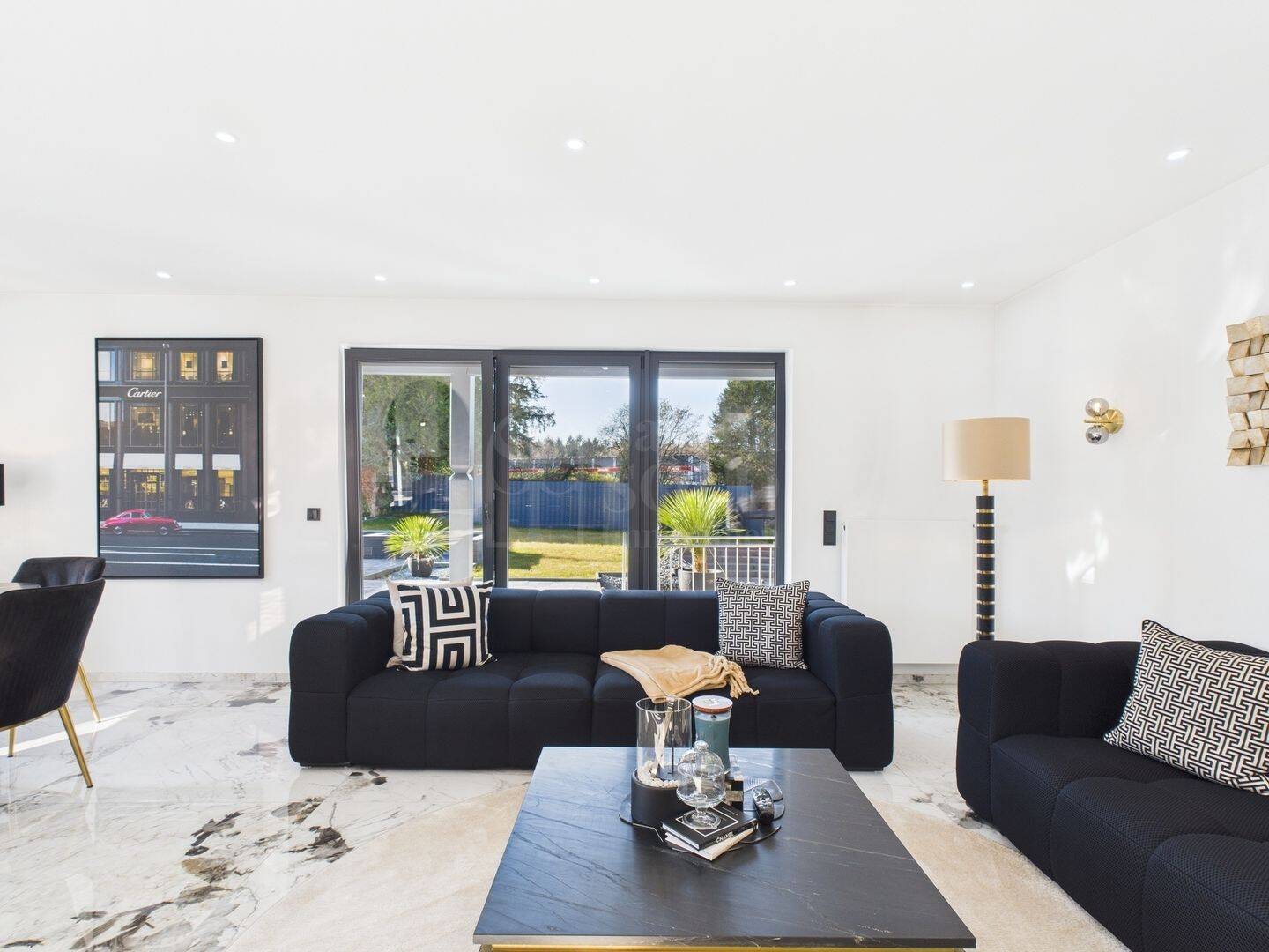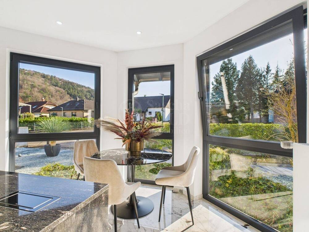 Eine große Terrasse bietet direkten Zugang zum gepflegten Garten mit Feuerstelle - ideal für entspannte Abende im Freien. Durch die zahlreichen Fenster ist das gesamte Erdgeschoss lichtdurchflutet und wirkt besonders hell und freundlich. Der Bodenbelag in dieser Wohnung besteht aus großformatigem italienischem Feinstein und unterstreicht die exklusive Ausstattung dieser Wohneinheit.