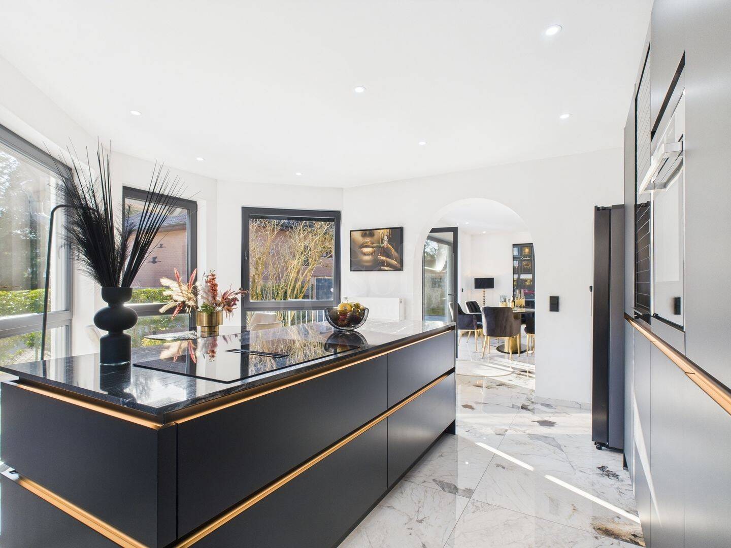 Die hochwertige Nolte-Küche ist voll ausgestattet mit Backofen, Spülmaschine, einer Kochinsel mit Granitplatte und einem Induktionsfeld mit integriertem Dunstabzug. Eine Ambientebeleuchtung sorgt für eine stilvolle Atmosphäre. Die Küche verfügt über einen Erker, in dem ein kleiner zusätzlicher Essbereich integriert wurde.