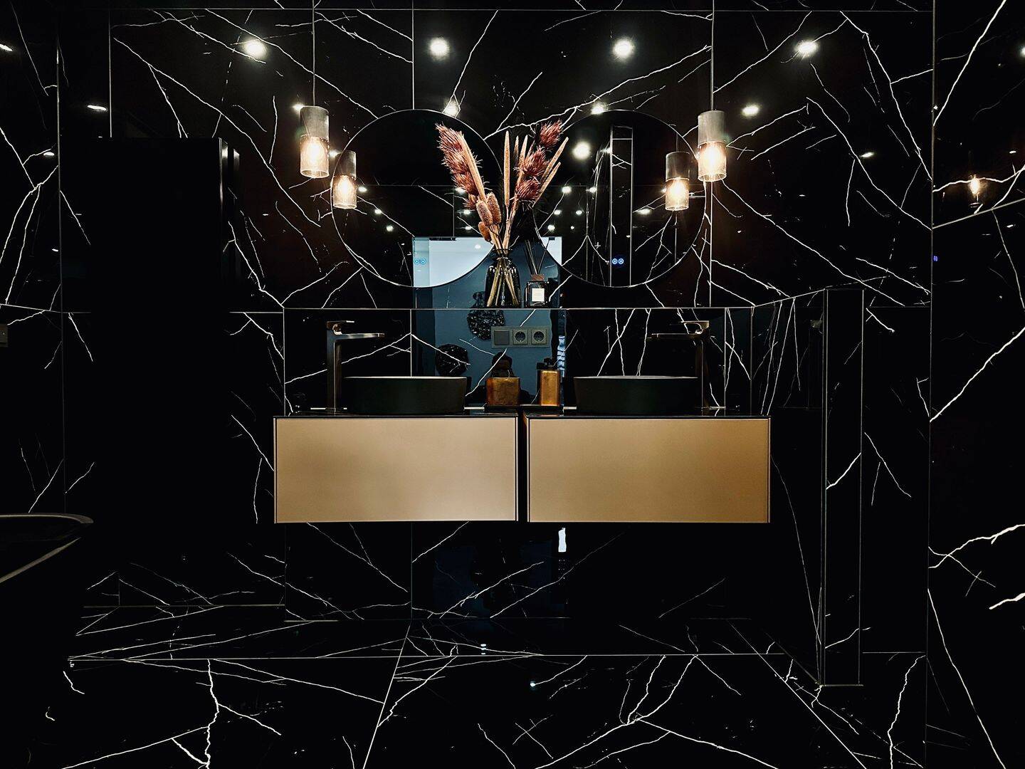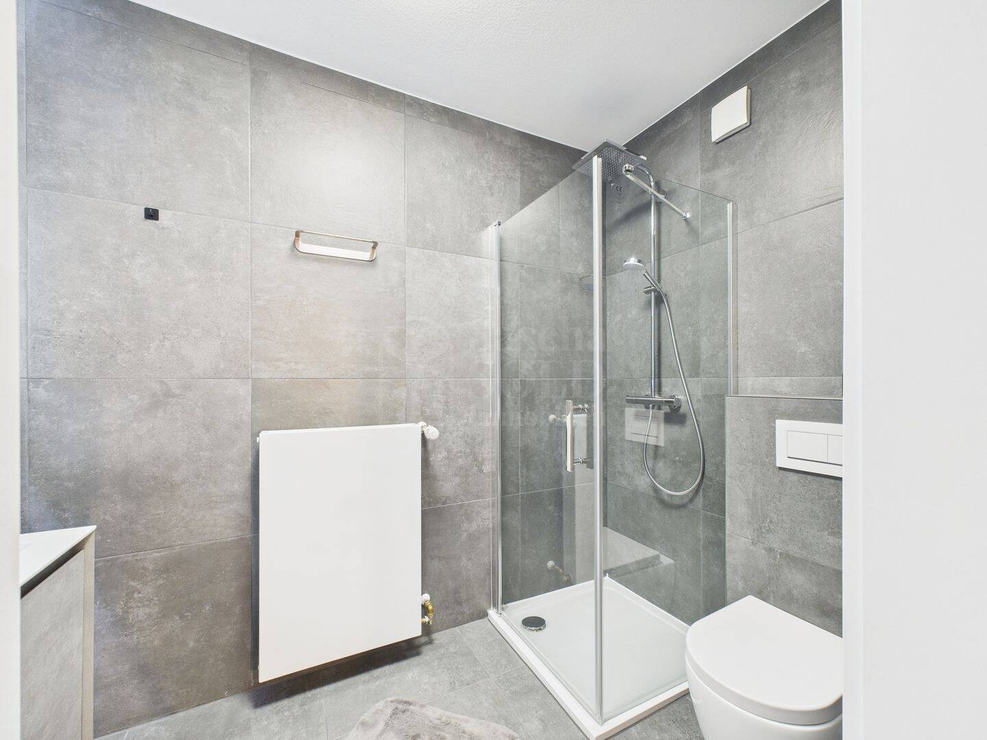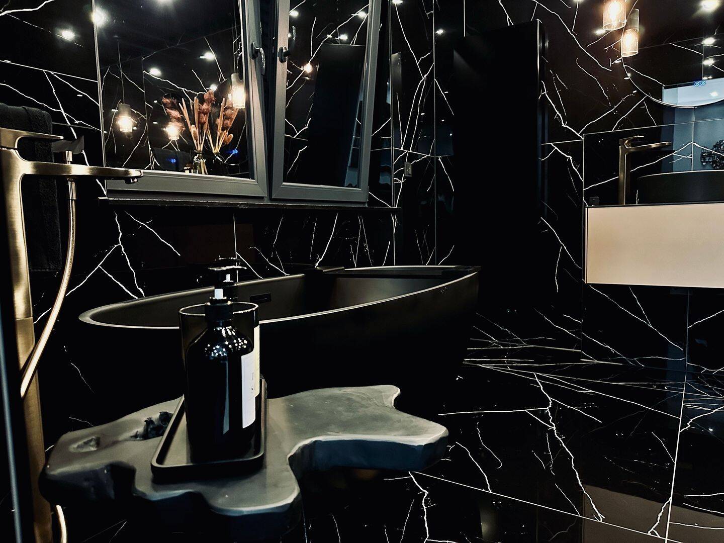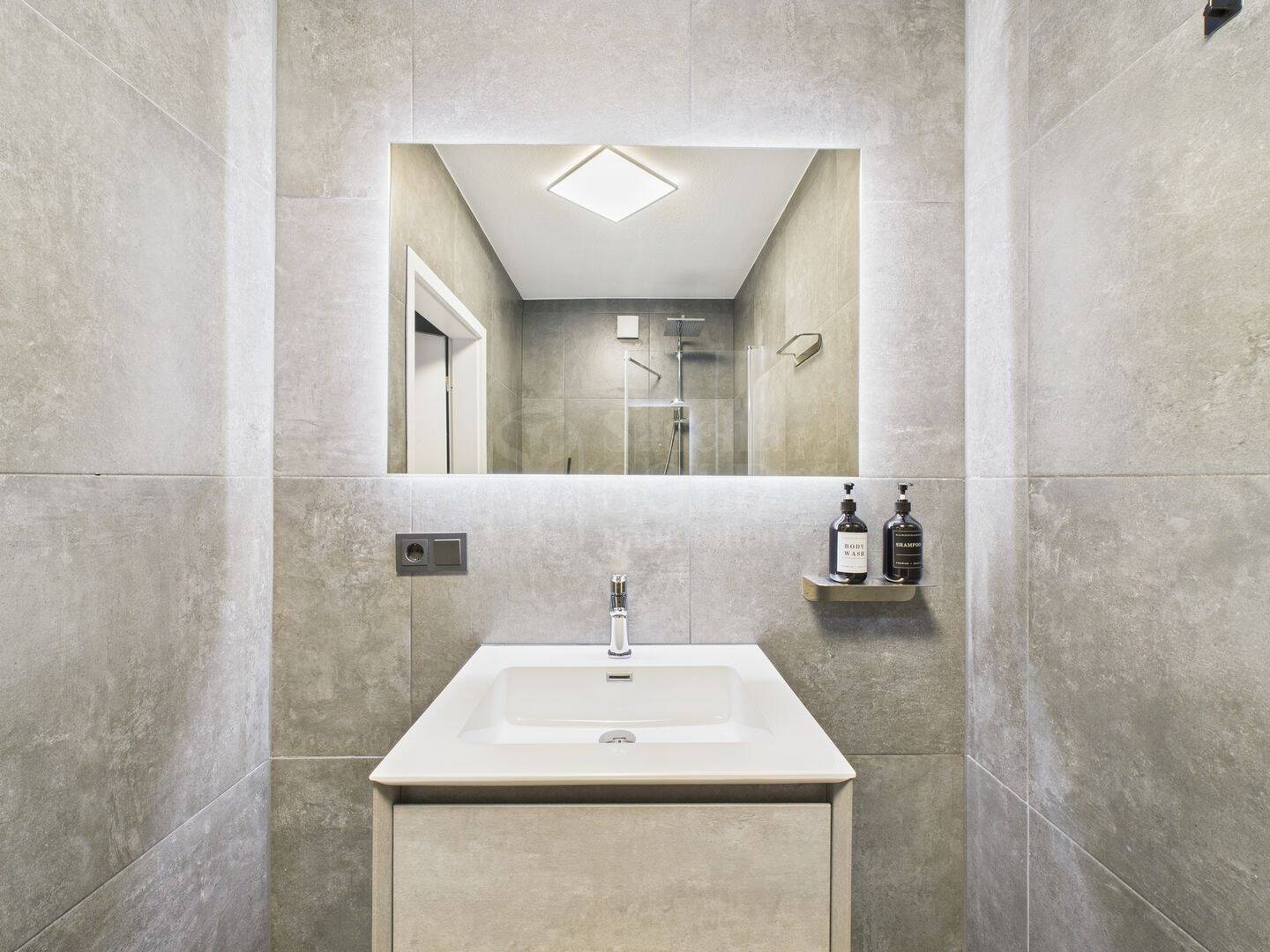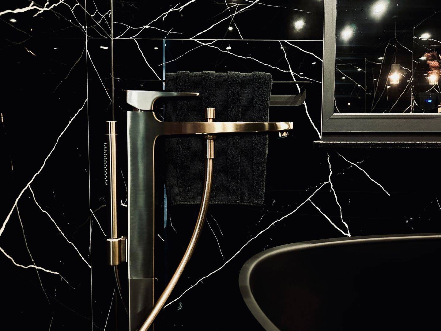 Das luxuriöse en Suite Bad beinhaltet eine freistehende Badewanne, eine begehbare Dusche, eine Toilette und zwei Waschbecken. Edle schwarze Großformatfliesen zieren sowohl den Boden als auch die Wände, was dem Raum eine exklusive Atmosphäre verleiht. Zusätzlich verfügt die Wohnung über ein separates Gäste-WC mit Toilette und Waschbecken.