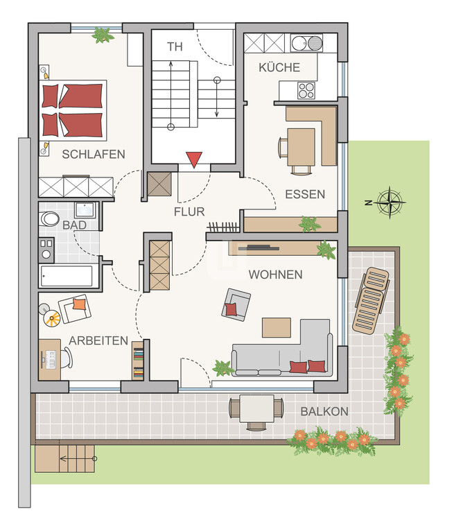 Ein besonderes Highlight ist der großzügige Balkon, der sich entlang der Süd- und Westseite der Wohnung erstreckt. Hier finden ein Tisch, Stühle sowie mehrere Liegen problemlos Platz – perfekt, um sonnige Stunden in ruhiger Atmosphäre zu genießen. Von hier ist über wenige Treppenstufen der zur Wohnung gehörende Garten erreichbar.