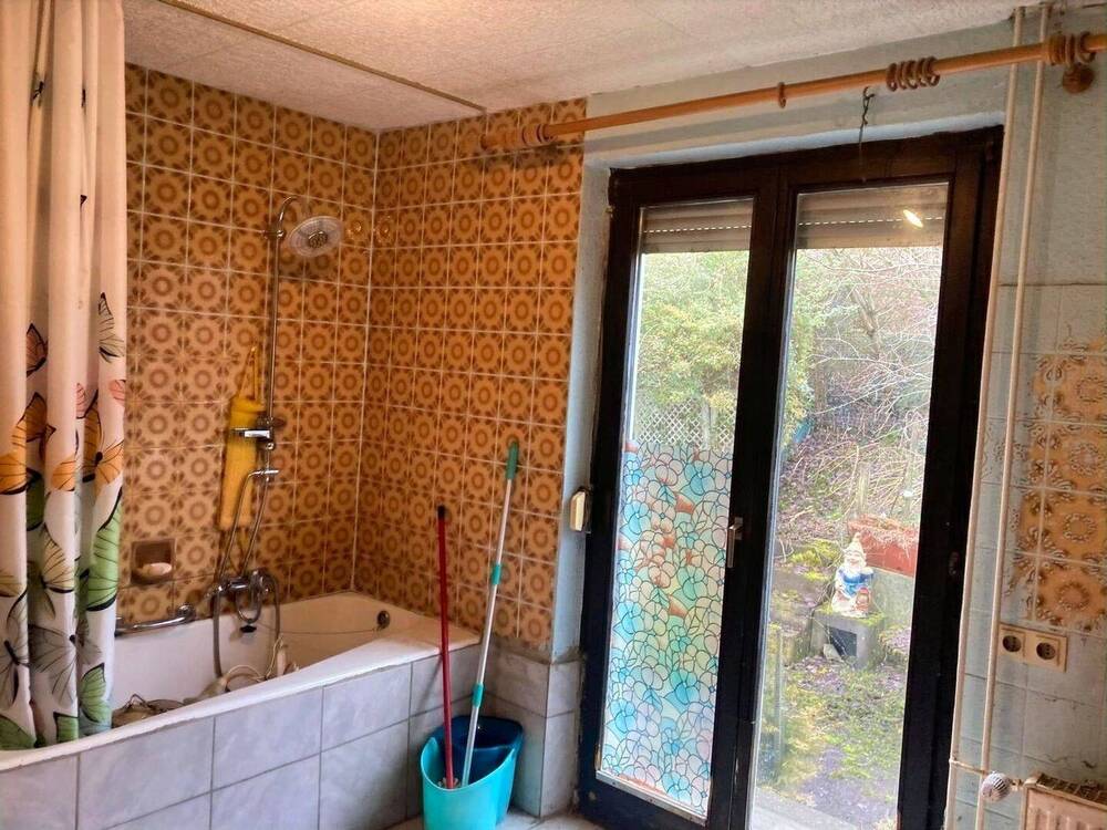 Badezimmer mit Badewanne und Gartenzugang -