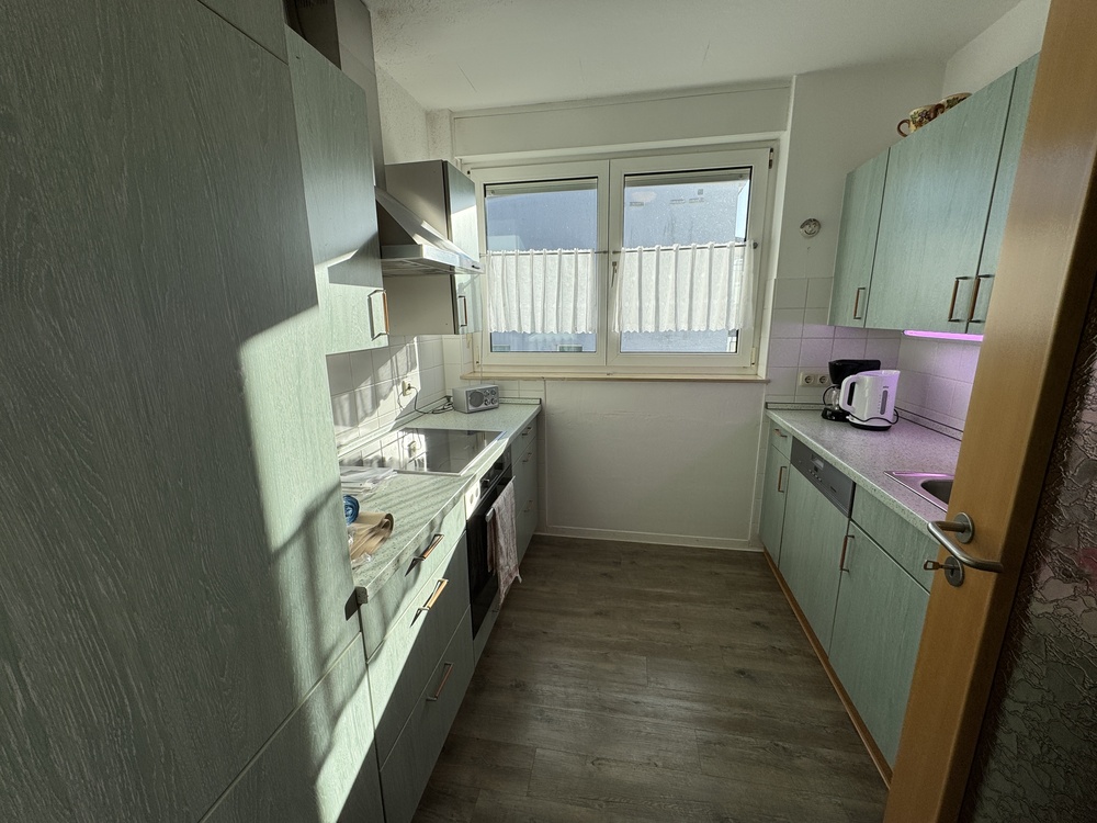 * Küche mit Einbauküche (Übernahme vom Vormieter möglich), Fliesenspiegel, wischbaren Boden und Fenster