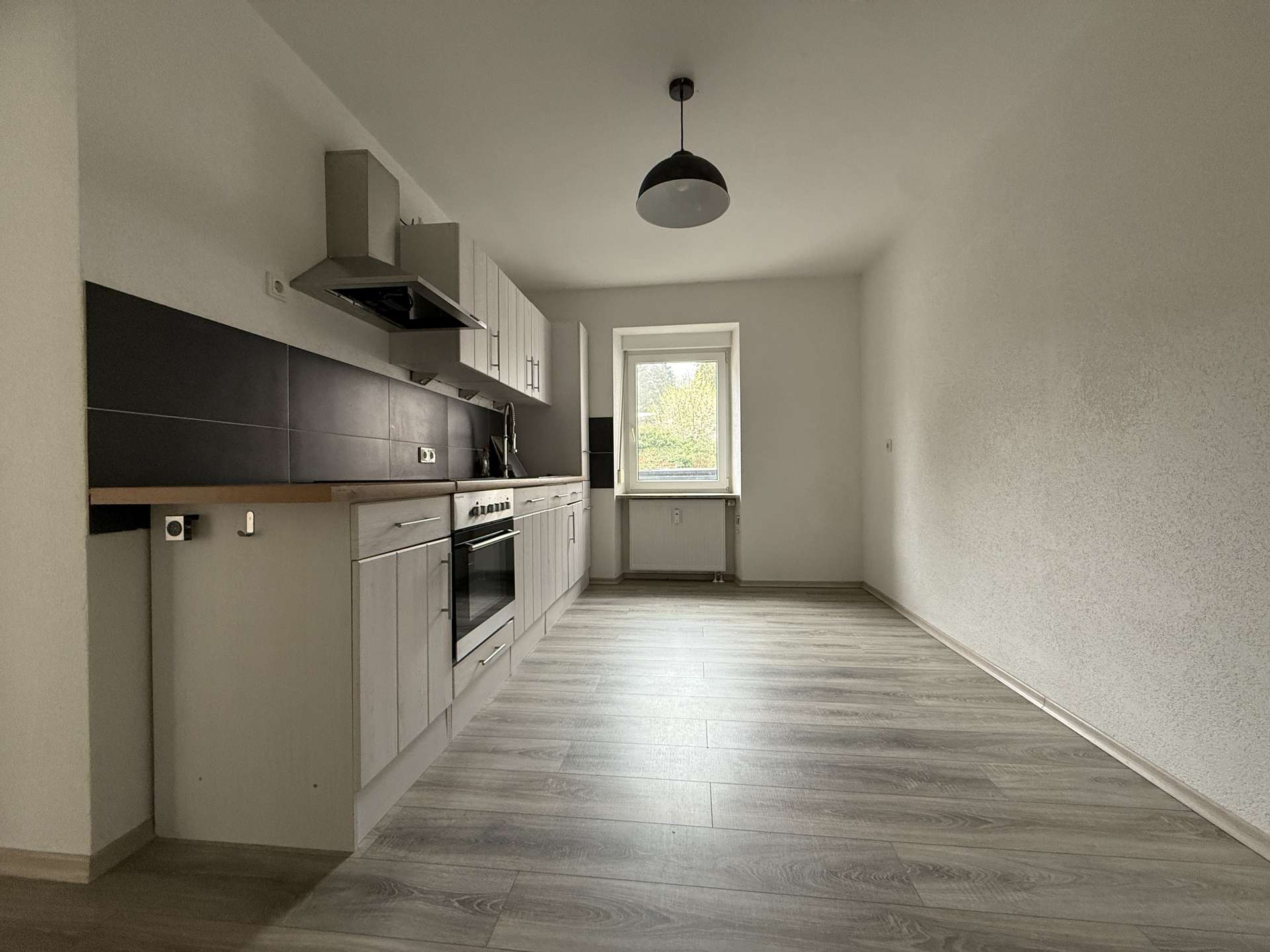 Der großzügige Wohn- und Essbereich ist offen gestaltet und bietet ein angenehmes Raumgefühl. Die separate Küche ist mit einer Einbauküche ausgestattet, die unter anderem über Herd, Backofen und Spülmaschine verfügt.