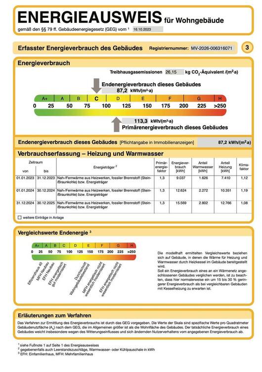| Energieverbrauchkennwert: | 87,2 kWh/(m²·a) kWh/(m²·a)