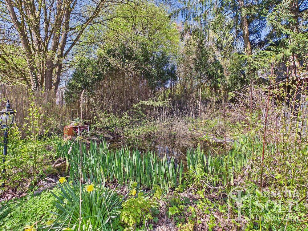 Die Außenanlagen sind großzügig angelegt und bieten einen direkten Übergang in die Natur, da das Grundstück unmittelbar an ein Waldgebiet angrenzt. Der Garten verfügt über einen überdachten Pool, der sanierungsbedürftig ist, sowie ein Gartenhaus, eine Teichanlage und einen gemauerten Grillkamin, die das Außenangebot ergänzen.