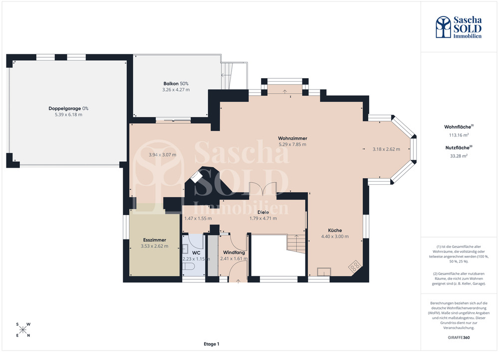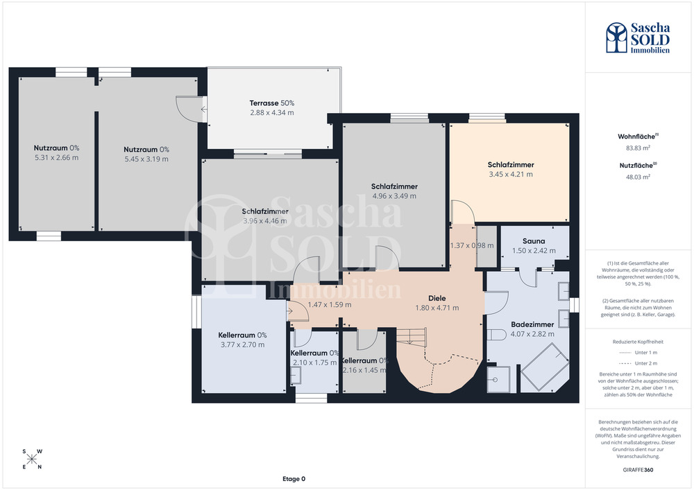 Alle Informationen basieren auf den Angaben des Eigentümers. Eine eigene Berechnung der Wohnfläche durch den Makler hat nicht stattgefunden. Die im Exposé angegebenen Wohn- und Nutzflächen sowie die dargestellten Grundrisse wurden nicht gemäß der Wohnflächenverordnung (WoFlV) eigenständig ermittelt. Sie basieren auf der digitalen 3D-Scan-Technologie der Giraffe360 Limited und stellen keine verbindliche Wohnflächenberechnung oder Architektenleistung dar. Für die Richtigkeit, Vollständigkeit und Maßhaltigkeit der Flächenangaben wird keine Gewähr übernommen. Dies gilt ebenso für die Angaben zum Energieausweis und zu den energetischen Eigenschaften, die ebenfalls auf den Daten des Eigentümers basieren und nicht eigenständig geprüft wurden. Angaben zu Heizungsanlagen, Technik oder sonstiger Ausstattung wurden ebenfalls nicht geprüft. Fotos, Videos, virtuelle Rundgänge, 3D-Darstellungen und Grundrisse dienen nur der Illustration, sind nicht maßstabgetreu und ersetzen keine persönliche Vor-Ort-Besichtigung oder Prüfung. Das Exposé sowie die darin gemachten Angaben in Wort, Bild und Zahlen stellen keine Beschaffenheitsvereinbarung dar. Wert- und Maßangaben sind lediglich Circa-Angaben. Es hat keine Einsicht in die Bauakte stattgefunden. Kaufinteressenten sind verpflichtet, das Objekt selbst zu besichtigen und alle relevanten Unterlagen eigenständig zu prüfen. Es wird keine Gewähr für die baurechtliche Zulässigkeit der Nutzung oder für vorhandene Genehmigungen übernommen. Kaufinteressenten müssen die Bebauungspläne und das Baurecht selbst prüfen. Bekannt gewordene Fehler werden umgehend korrigiert. Der Makler übernimmt keine Haftung für die Richtigkeit und Vollständigkeit der Angaben. Änderungen, Irrtümer und Zwischenverkauf bleiben vorbehalten.