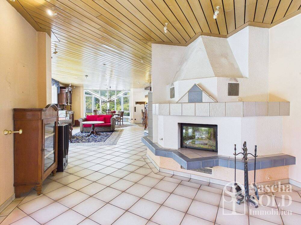 Ein Kamin bildet einen weiteren Mittelpunkt des Wohnbereichs. Dieser entspricht nicht mehr den aktuellen gesetzlichen Anforderungen und ist vor einer erneuten Inbetriebnahme durch einen Fachbetrieb zu sanieren. Angrenzend befindet sich zudem eine Bauernstube mit Kühlschrank und Zapfanlage, die sich ideal für gesellige Stunden eignet. Direkt gegenüber führt eine große Schiebetür auf einen Südwestbalkon mit Markise, von dem aus eine Treppe direkt in den Garten hinabführt.
