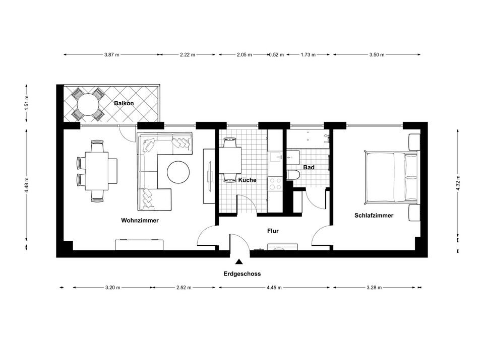 Das großzügige Wohnzimmer bildet den zentralen Mittelpunkt der Wohnung und bietet direkten Zugang zum Balkon, der an warmen Tagen zum Verweilen im Freien einlädt. Das gegenüberliegende Schlafzimmer überzeugt durch seine ruhige Lage und schafft eine angenehme Rückzugsmöglichkeit. Die separate Küche ist mit einer Einbauküche ausgestattet und bietet zusätzlich Platz für einen kleinen Essbereich sowie einen Waschmaschinenanschluss.
