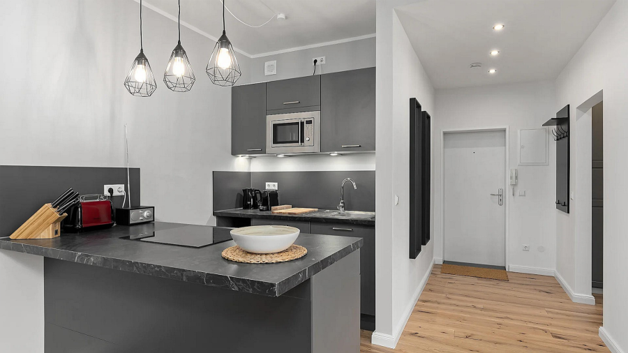Die Wohnung lässt keine Wünsche offen. Neben einem tollen Balkon nach hinten ins Ruhige, ist diese mit einem hochwertigen Vollholzparkett ausgestattet, welcher im Einklang mit der dunklen, modernen Einrichtung besonders gut harmoniert.